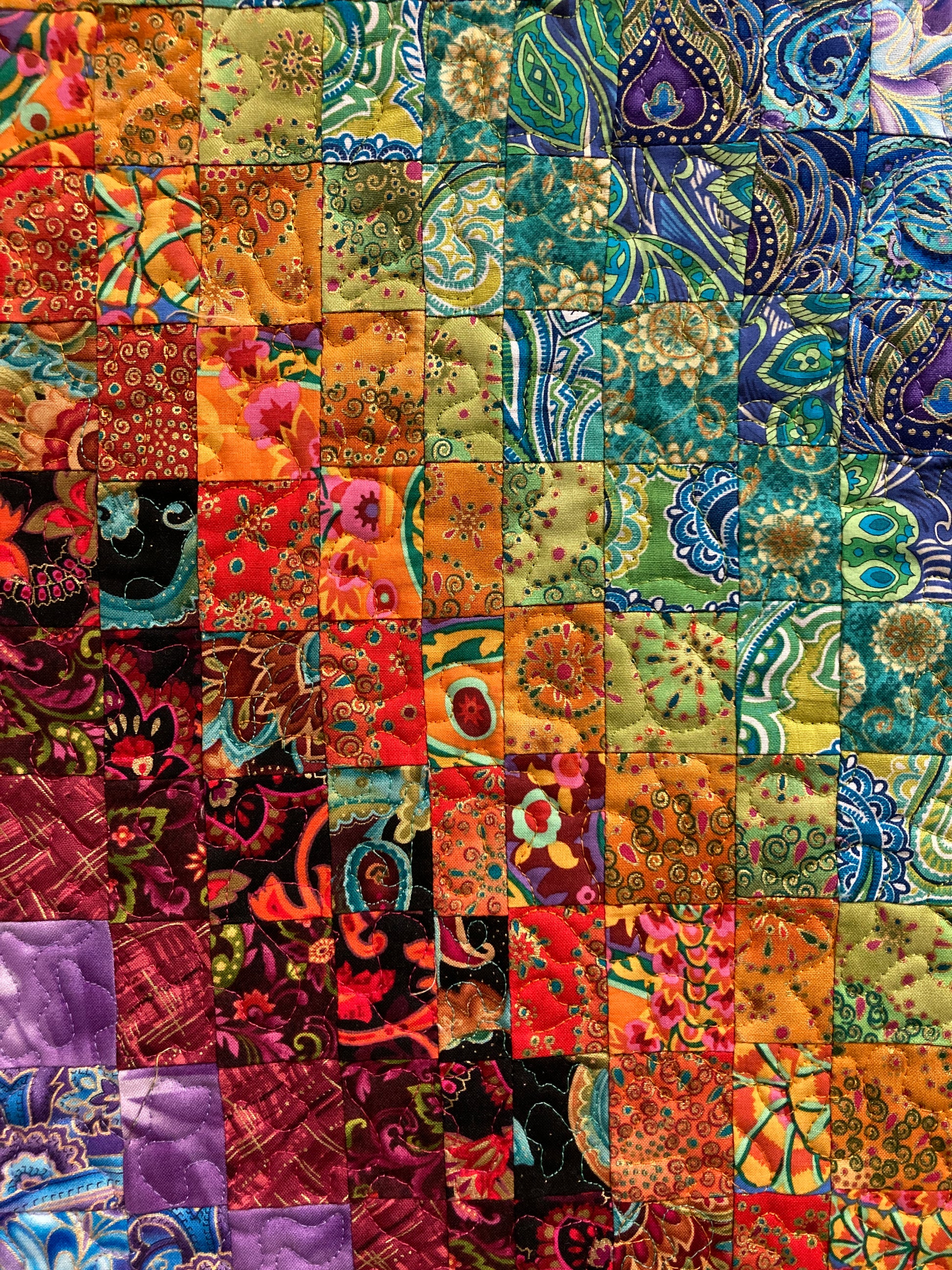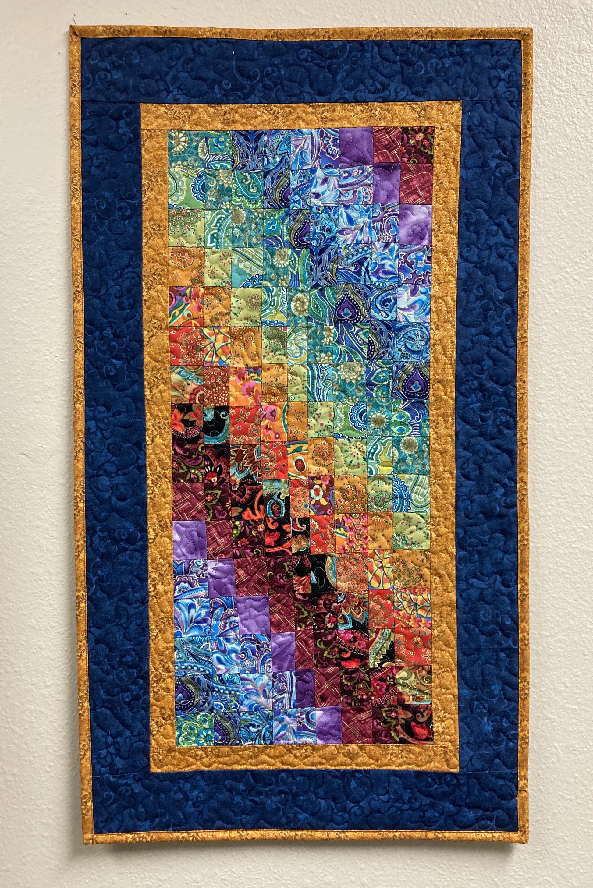 A myriad of bright fabrics pop out of this art quilt tapestry. Paisley designs, Kaffe Fassett bold prints, and abstract motifs create a colorful movement through this design. Whether for a wall or table, the vibrancy of the colors in this piece will serve as a focal point in your room. The inside border is a gold fabric, and the large outer border is a dark blue fabric pulling out the color tones of the middle fabrics. Small rings were sewn at the top back for hanging the quilt.