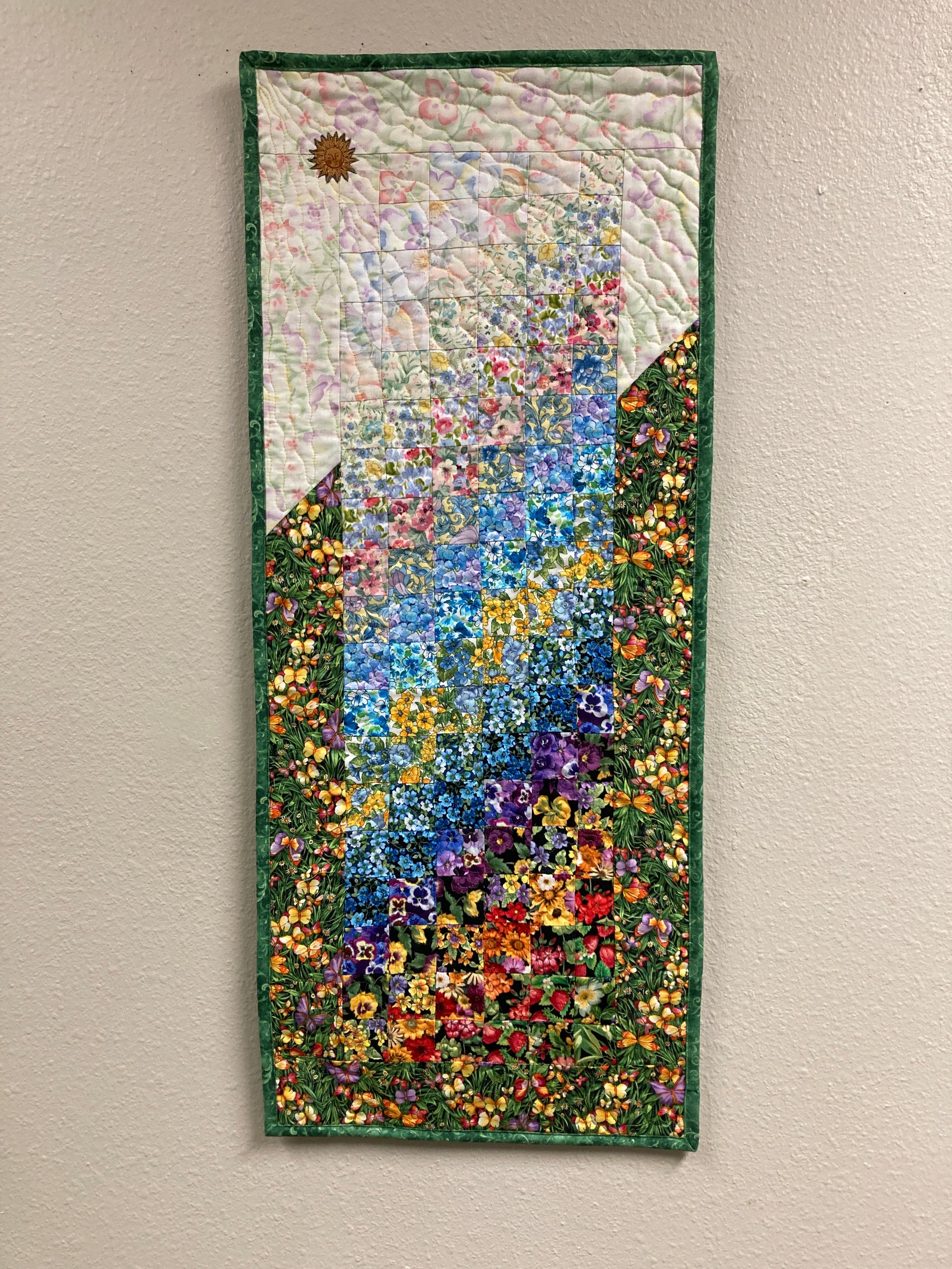 Morning sunshine brings this blooming garden to life in this quilted fabric wall hanging. The flowers transition from soft yellows and blues to saturated tones near the bottom. The border is sliced with a yellow vine fabric at the top and a green grass flower fabric at the bottom to complete the garden setting. A smiling sunny face sits among the sun rays in the top left corner.