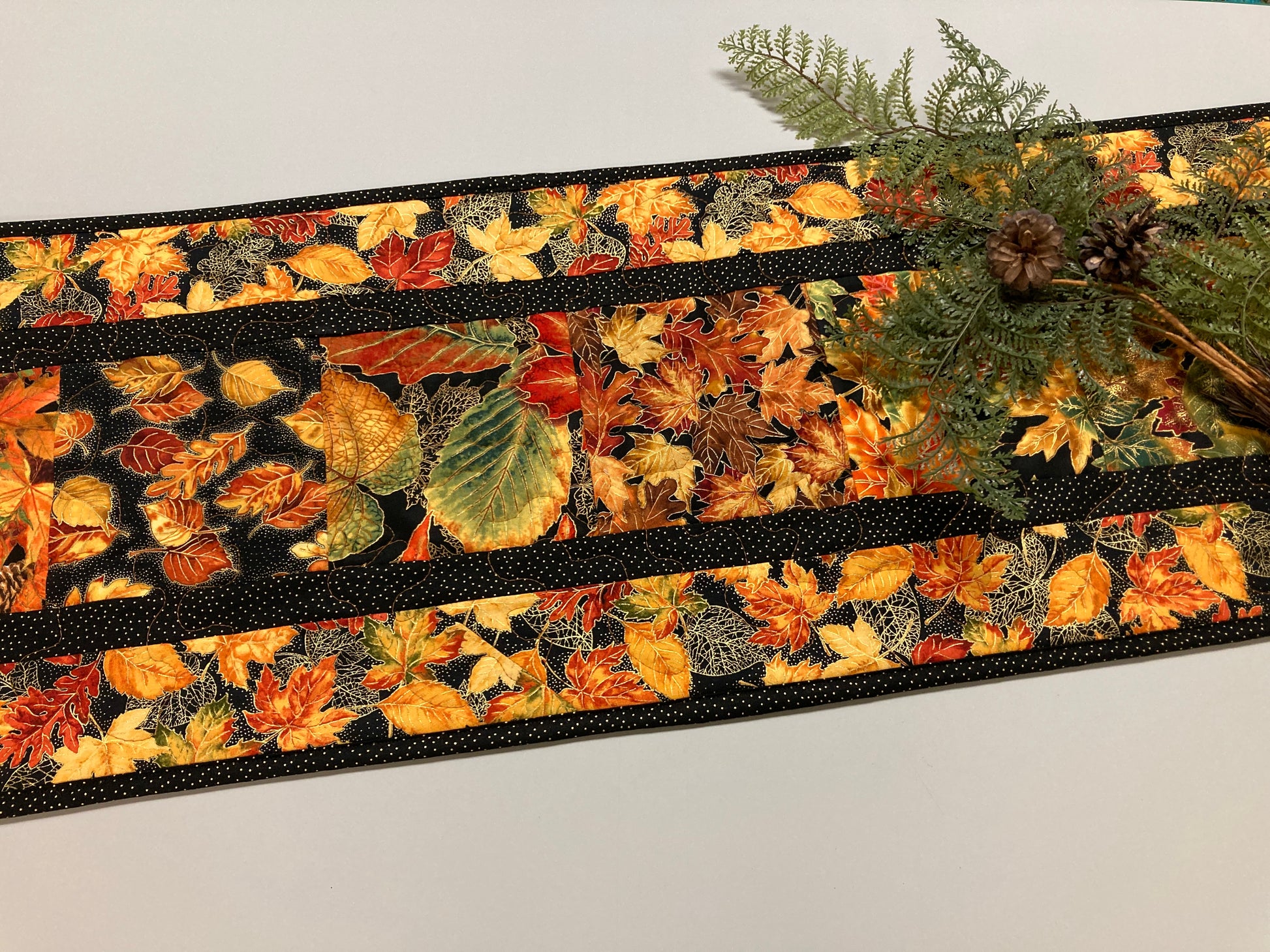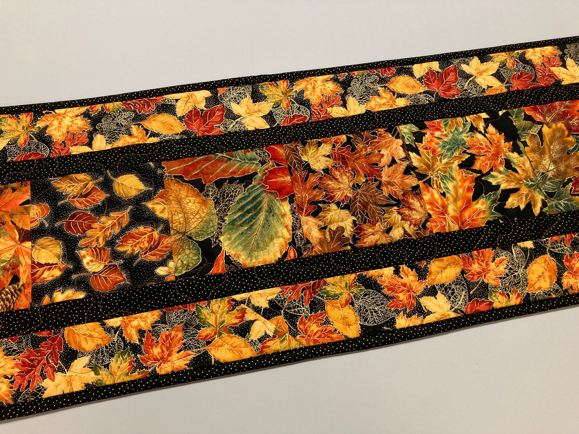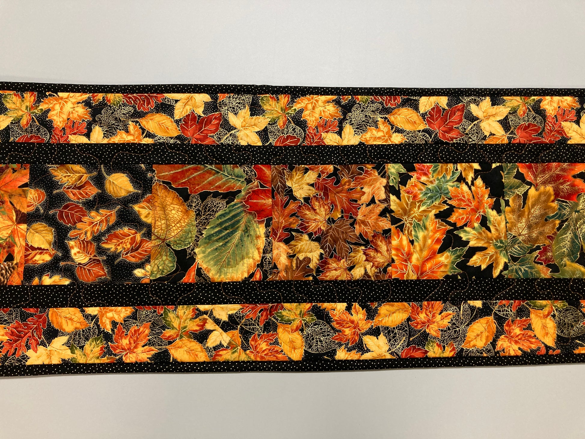 All the glorious colors of fall are found in this quilted table runner. The rust border fabric provides an elegant setting for your autumn decor. The autumnal colored leaves, represented in strips of varying fall colors, seem to pop off the fabric. The back is a poinsettia print. Use this runner though Thanksgiving then reverse for Christmas - two runners for the price of one!