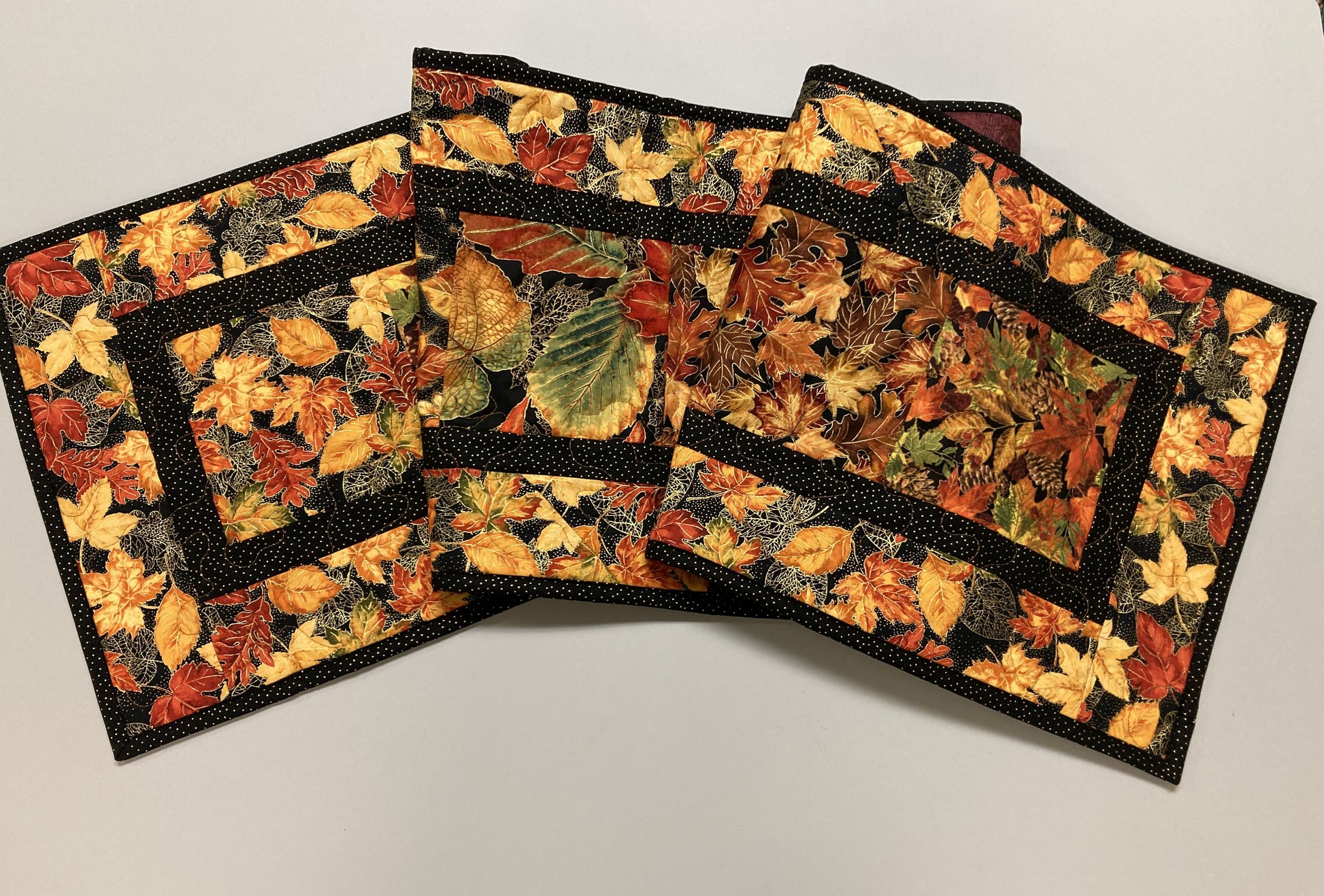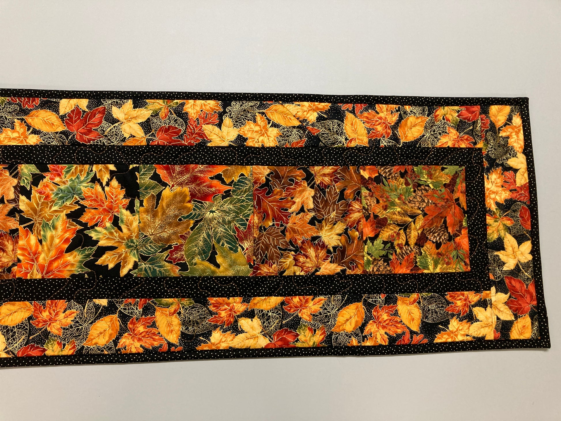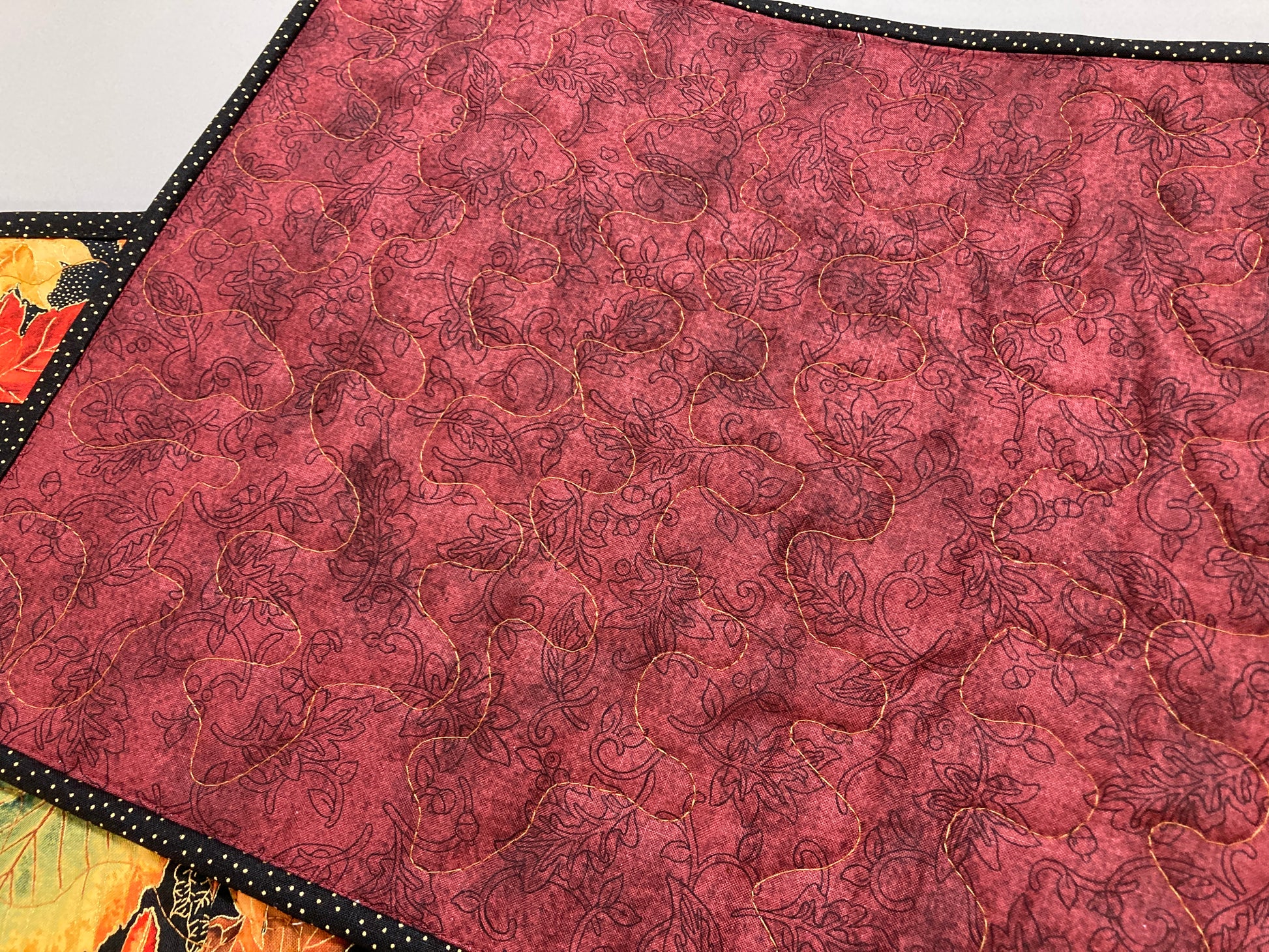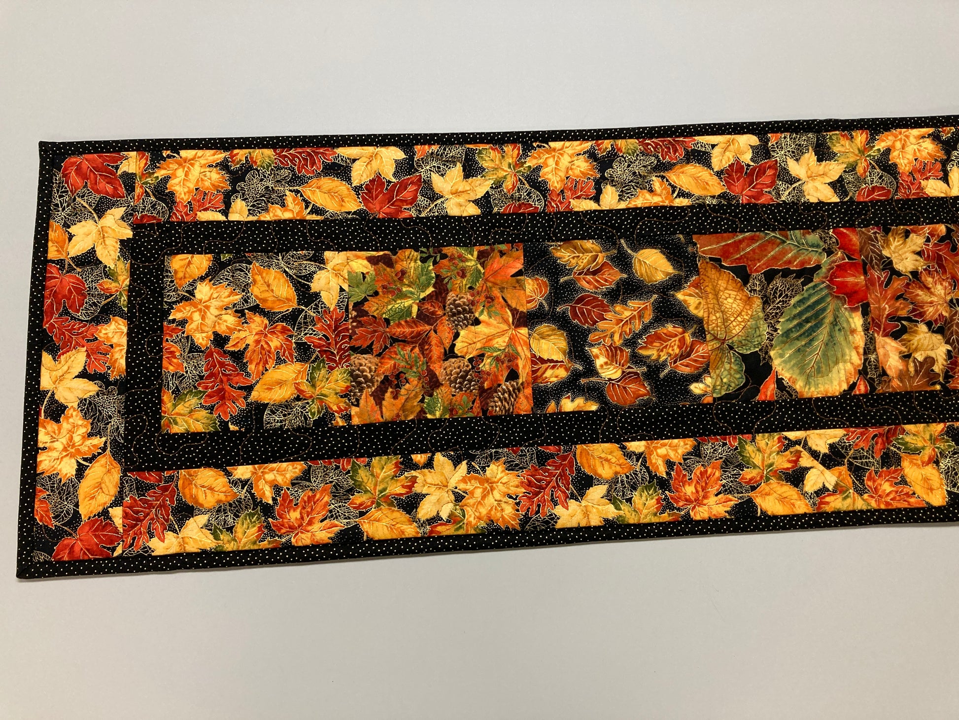 All the glorious colors of fall are found in this quilted table runner. The rust border fabric provides an elegant setting for your autumn decor. The autumnal colored leaves, represented in strips of varying fall colors, seem to pop off the fabric. The back is a poinsettia print. Use this runner though Thanksgiving then reverse for Christmas - two runners for the price of one!