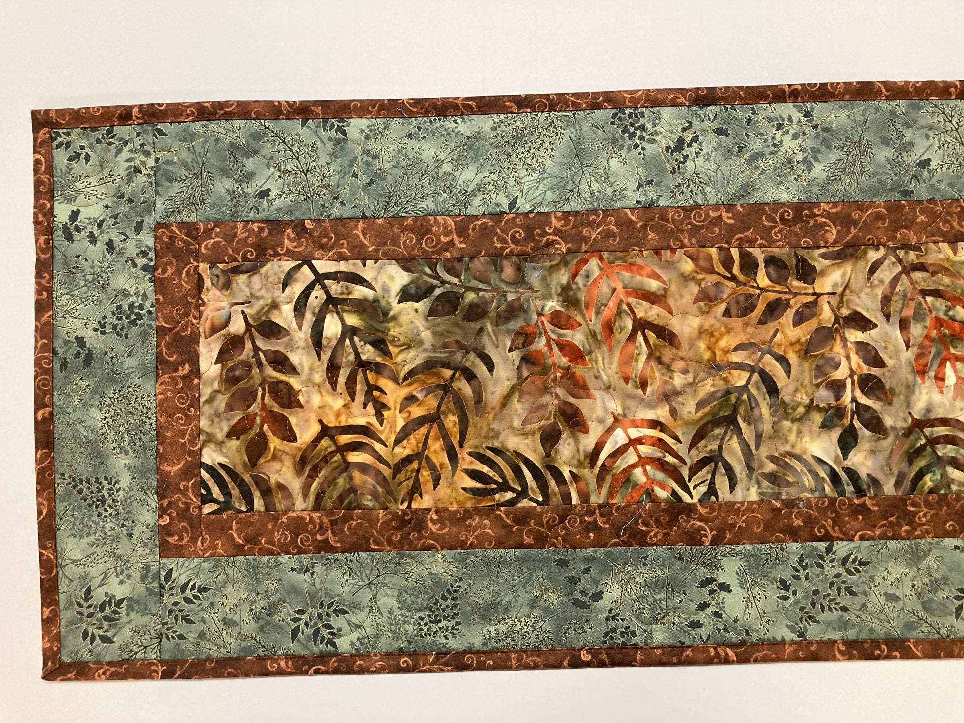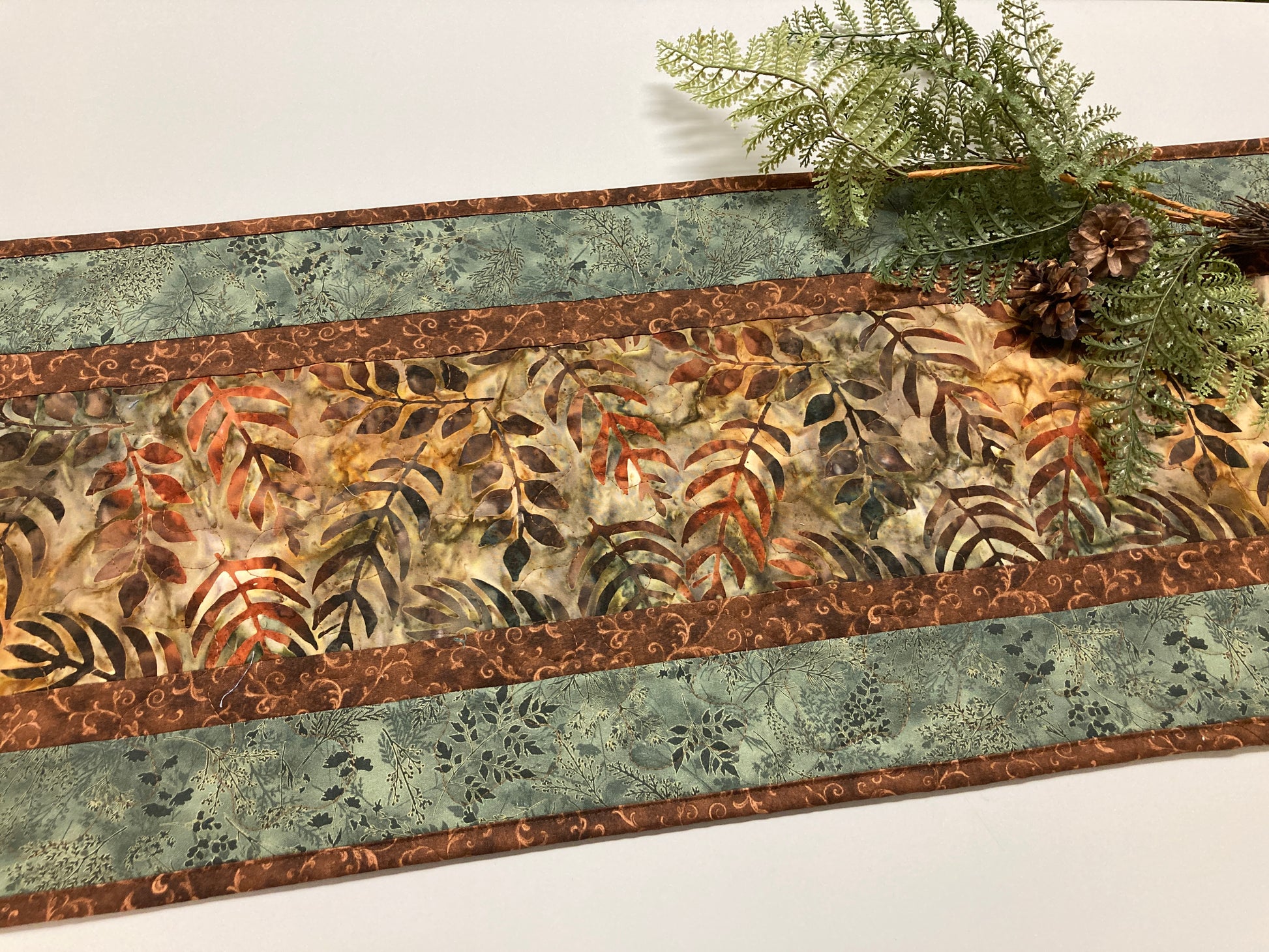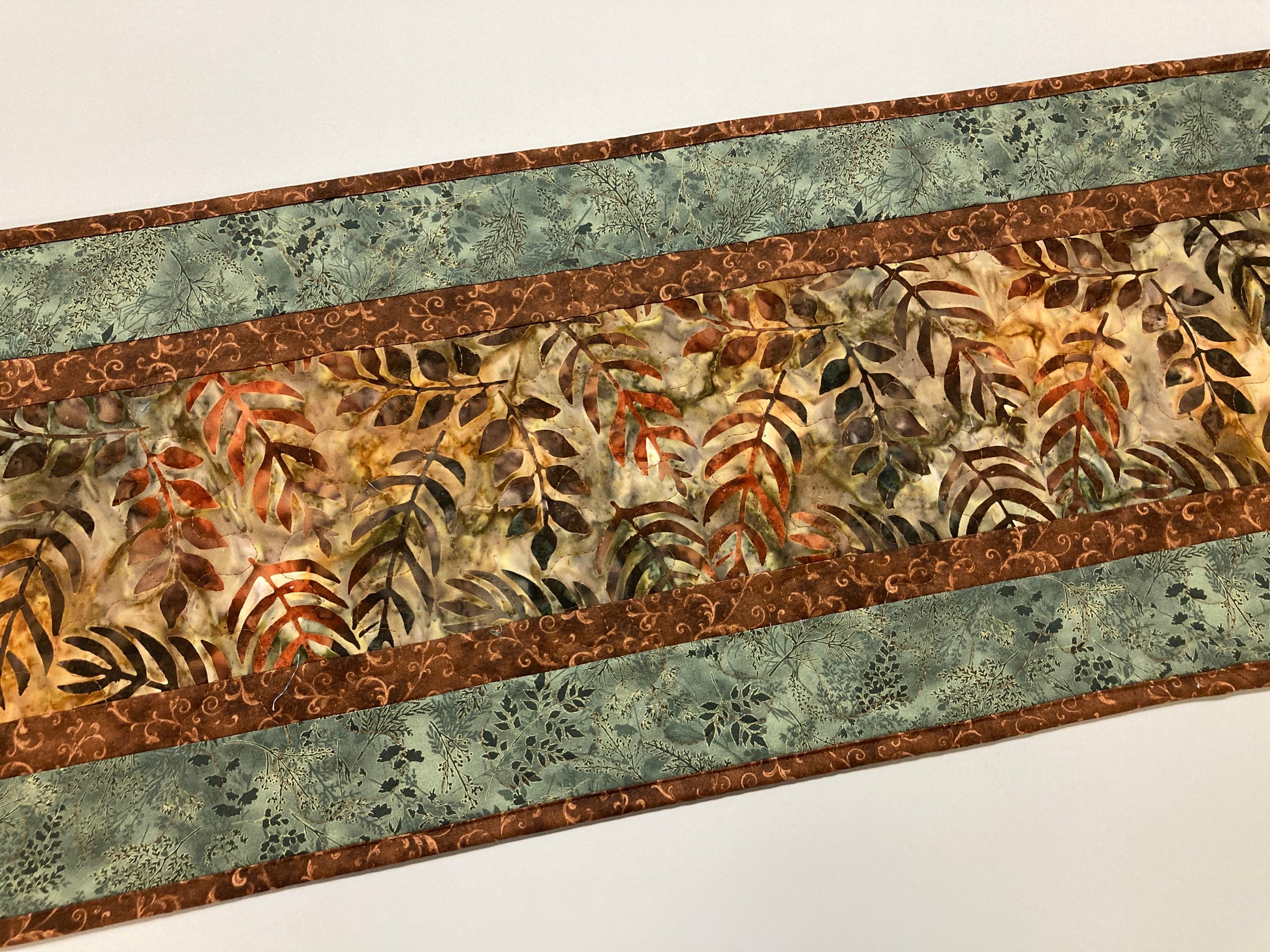 A golden brown rust batik leaf design fabric was used on the middle of this quilted table runner. The sage green vine border sets off the fall autumn theme beautifully. The back is a summer green fabric having you ready for other seasonal decor. A beautiful piece with a more muted fall look for your home.