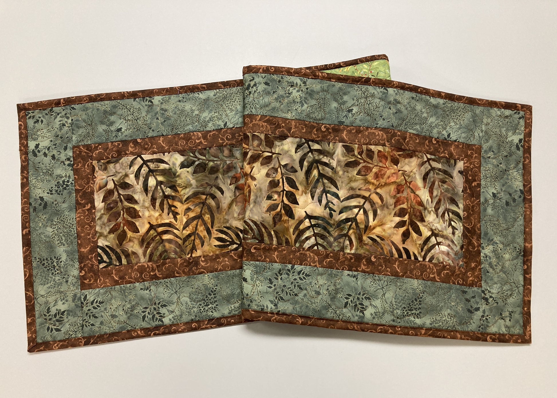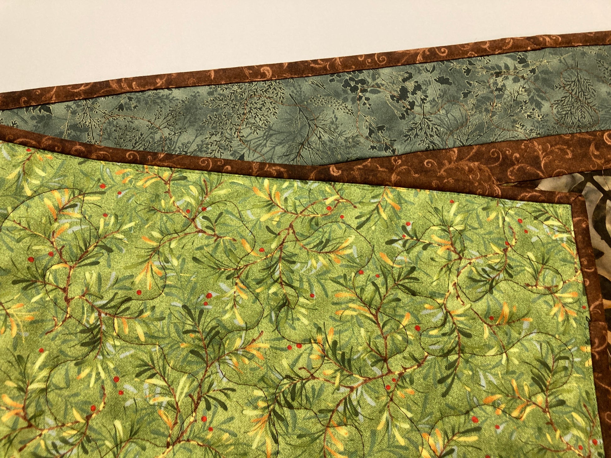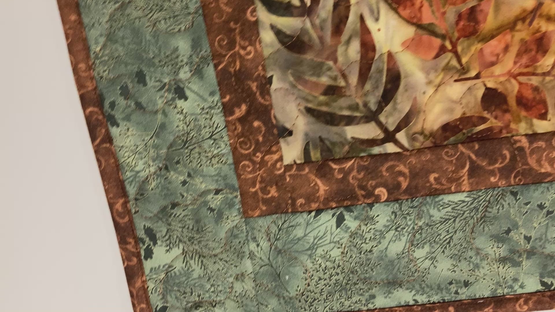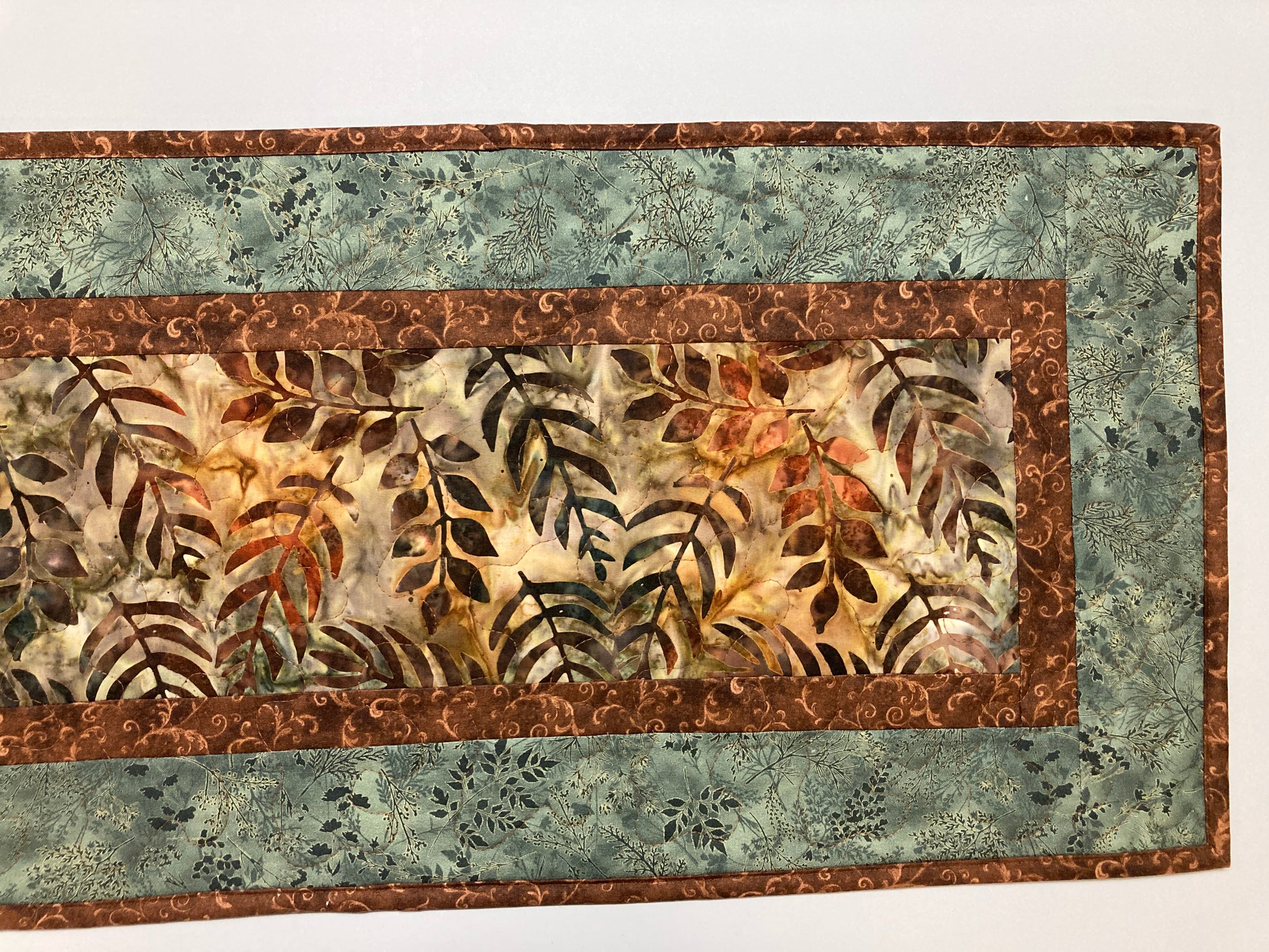 A golden brown rust batik leaf design fabric was used on the middle of this quilted table runner. The sage green vine border sets off the fall autumn theme beautifully. The back is a summer green fabric having you ready for other seasonal decor. A beautiful piece with a more muted fall look for your home.