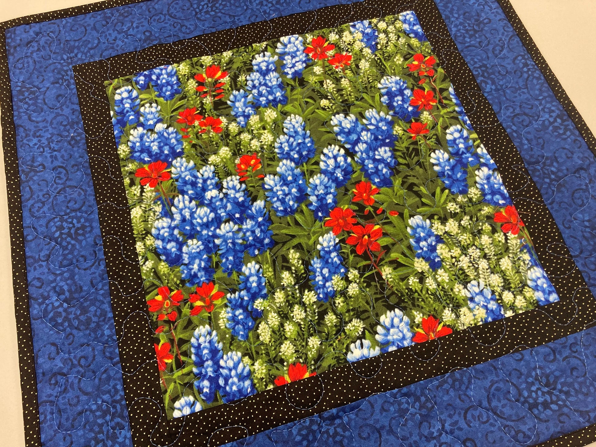Blue Bonnets Red Flowers Quilted Table Topper, Reversible Mat, 18x18" Coffee Table End Table Nightstand, Large Square Summer Spring Decor