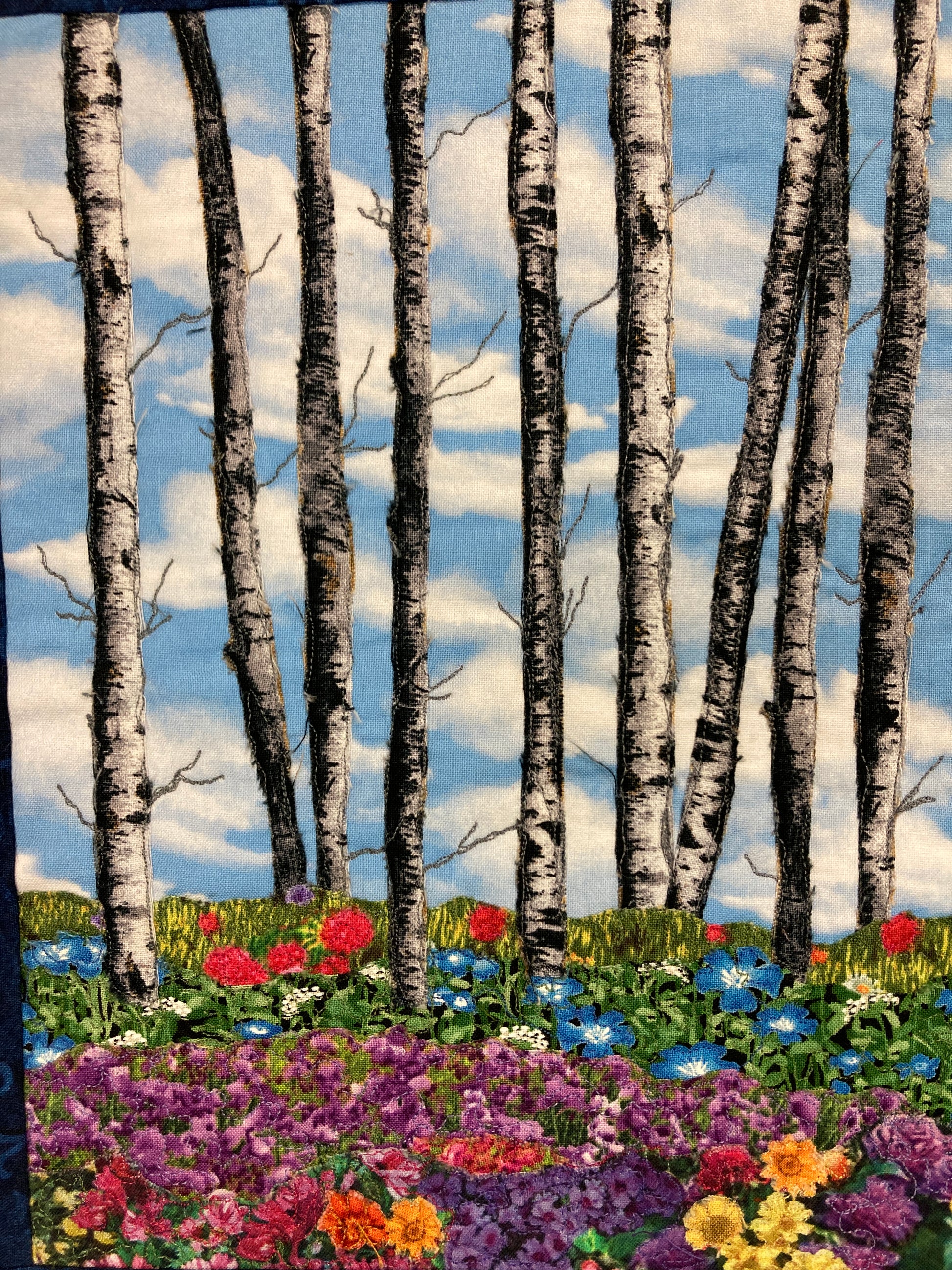 Aspen trees against an blue sky sky stand among purple, blue, yellow and pink flowers in this small art quilt tapestry. The trees in the image appear to be regressing in the quilt with the vivid flowers in the foreground. The perfect fabric wall hanging for any place in your home or office to bring in the glorious colors of fall!