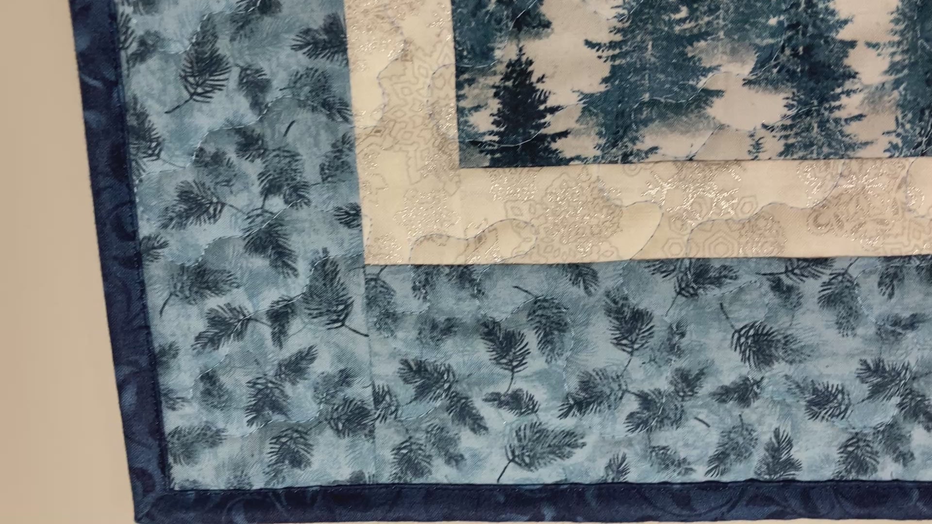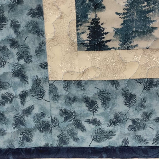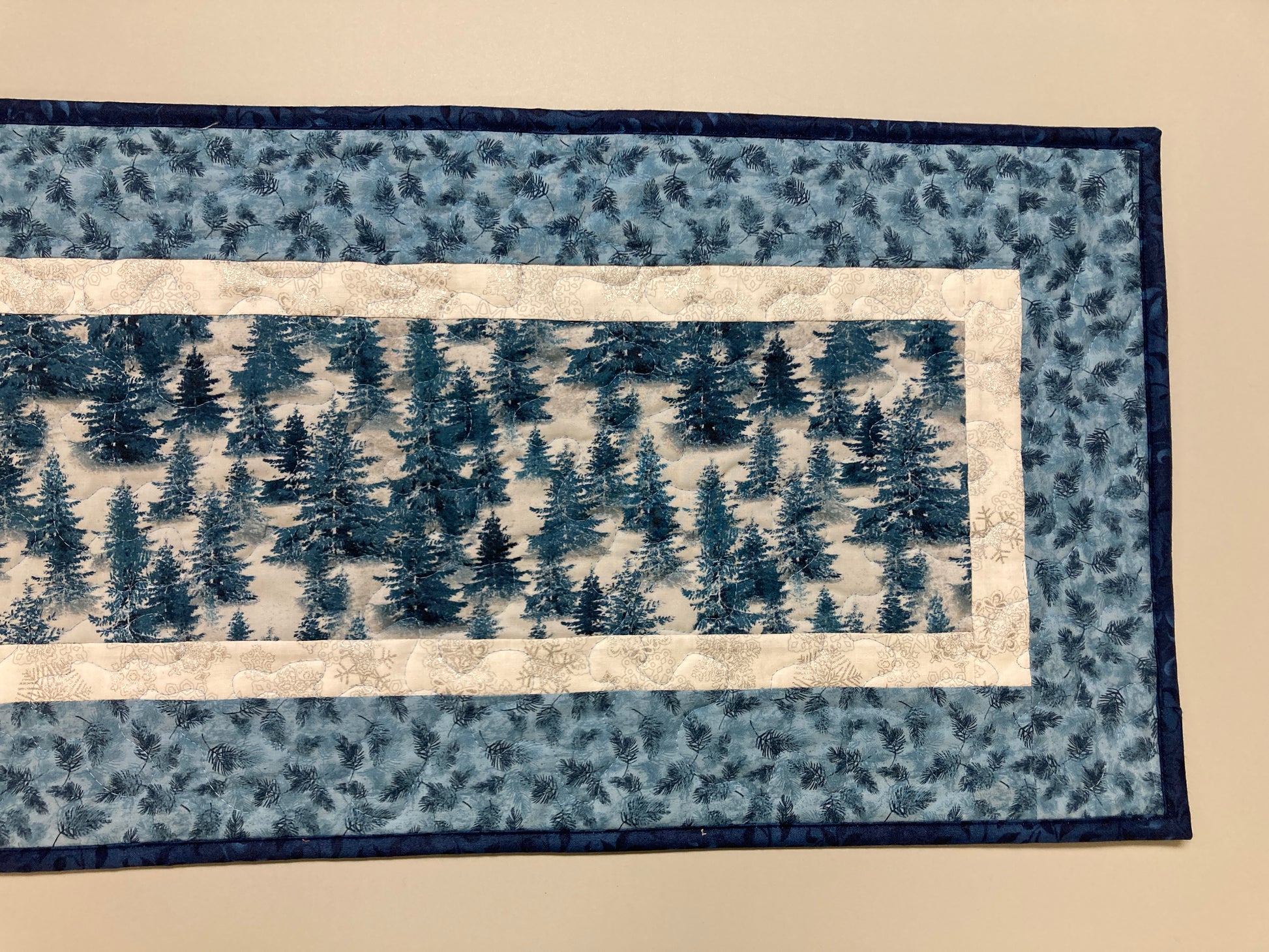 Blue snowy pine trees in the middle of winter grace this quilted table runner. A light blue pine cone print completes this serene image. This runner is perfect through our snowy winter season and into the new year! The back is a wispy gray tree fabric, having your ready for other seasonal decor.