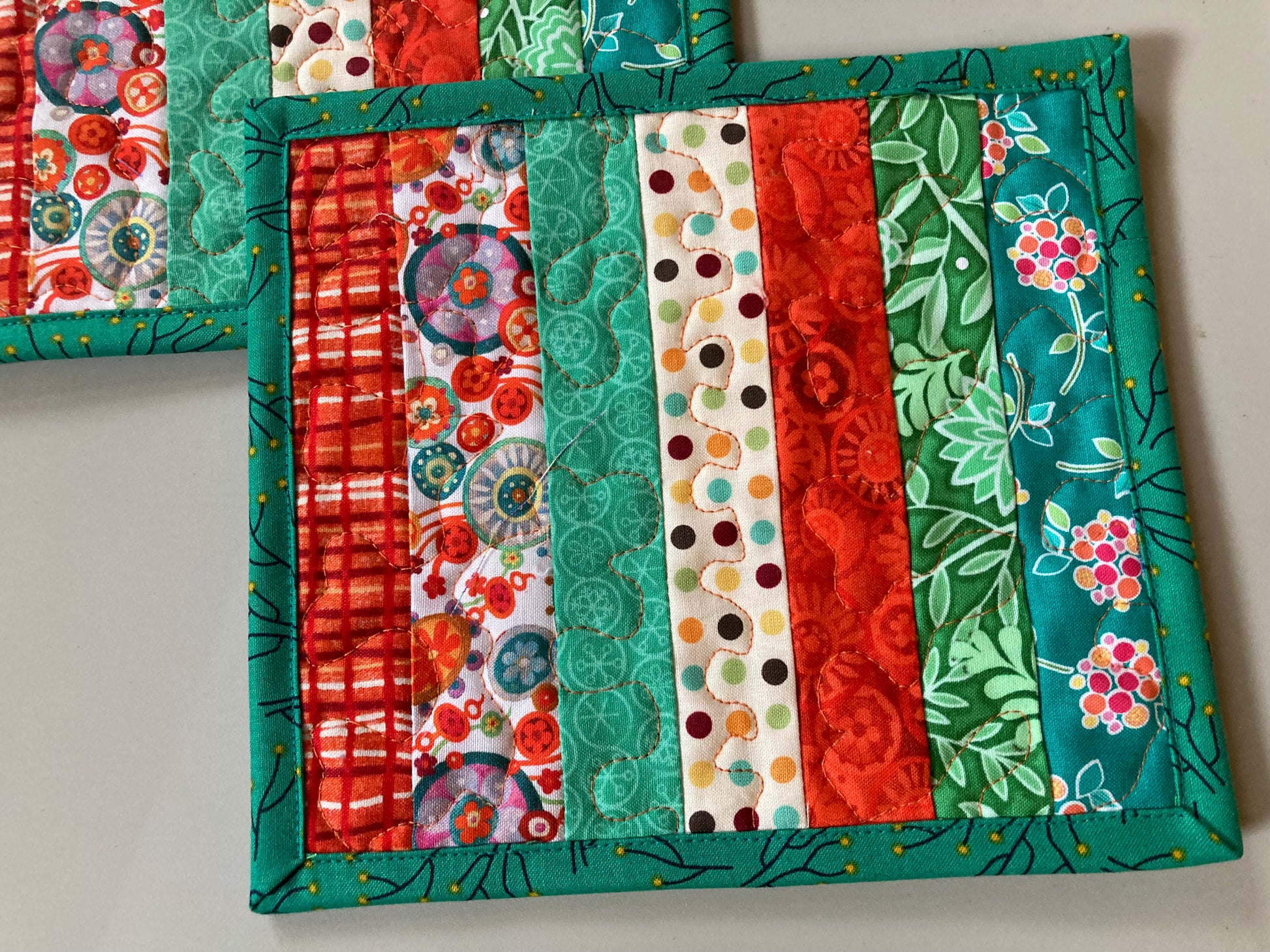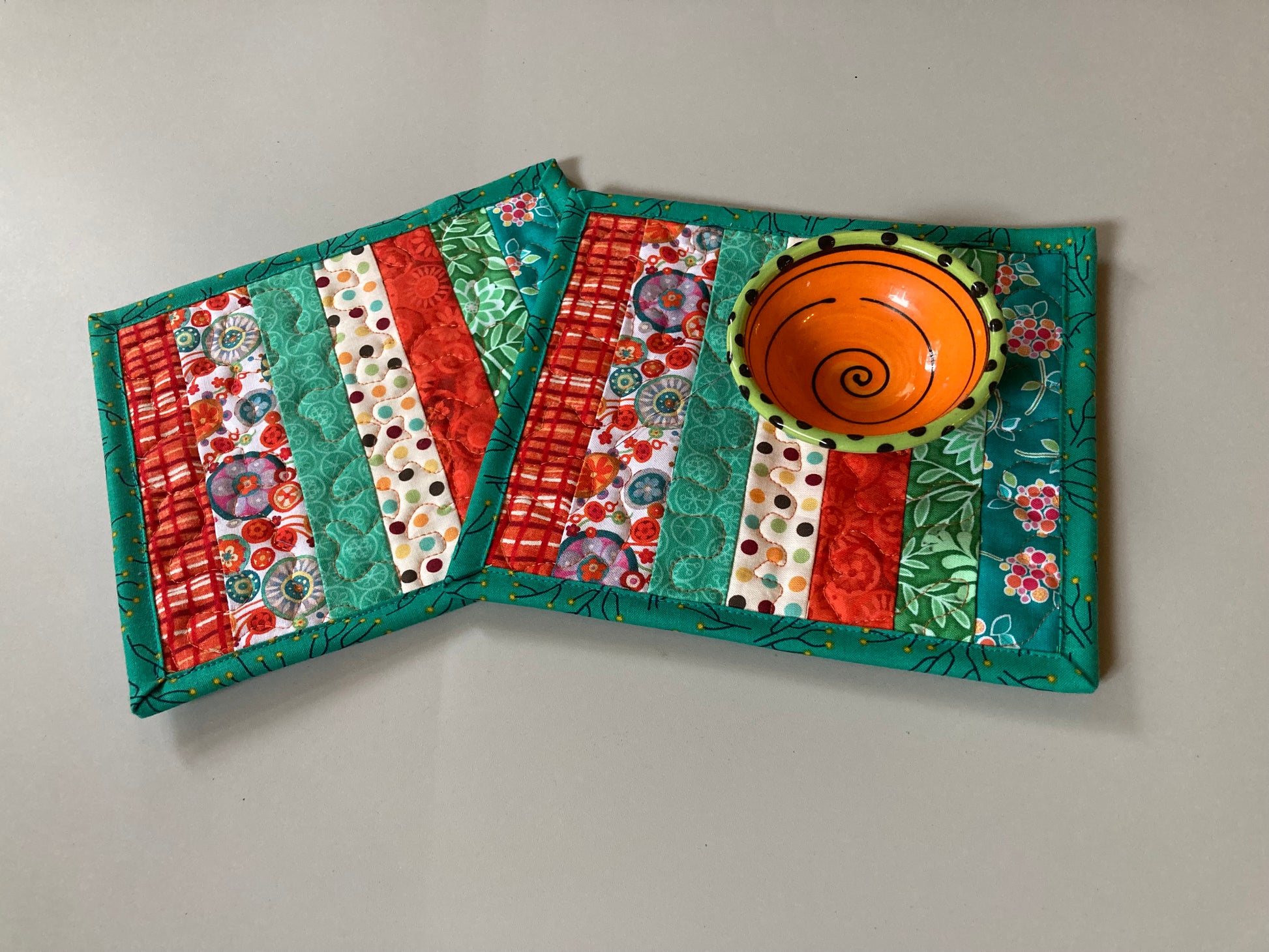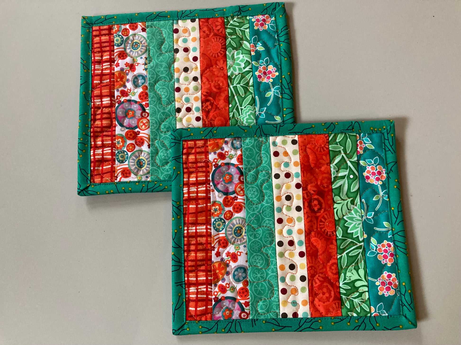 Bright Orange Turquoise Summer Mug Rug Snack Mat Set of (2) Coffee End Table, Large Coasters 7x8", Quilted Boho Scrappy Bright Handmade