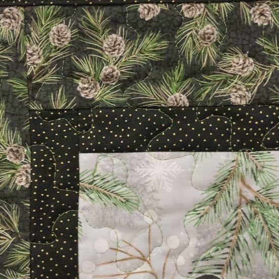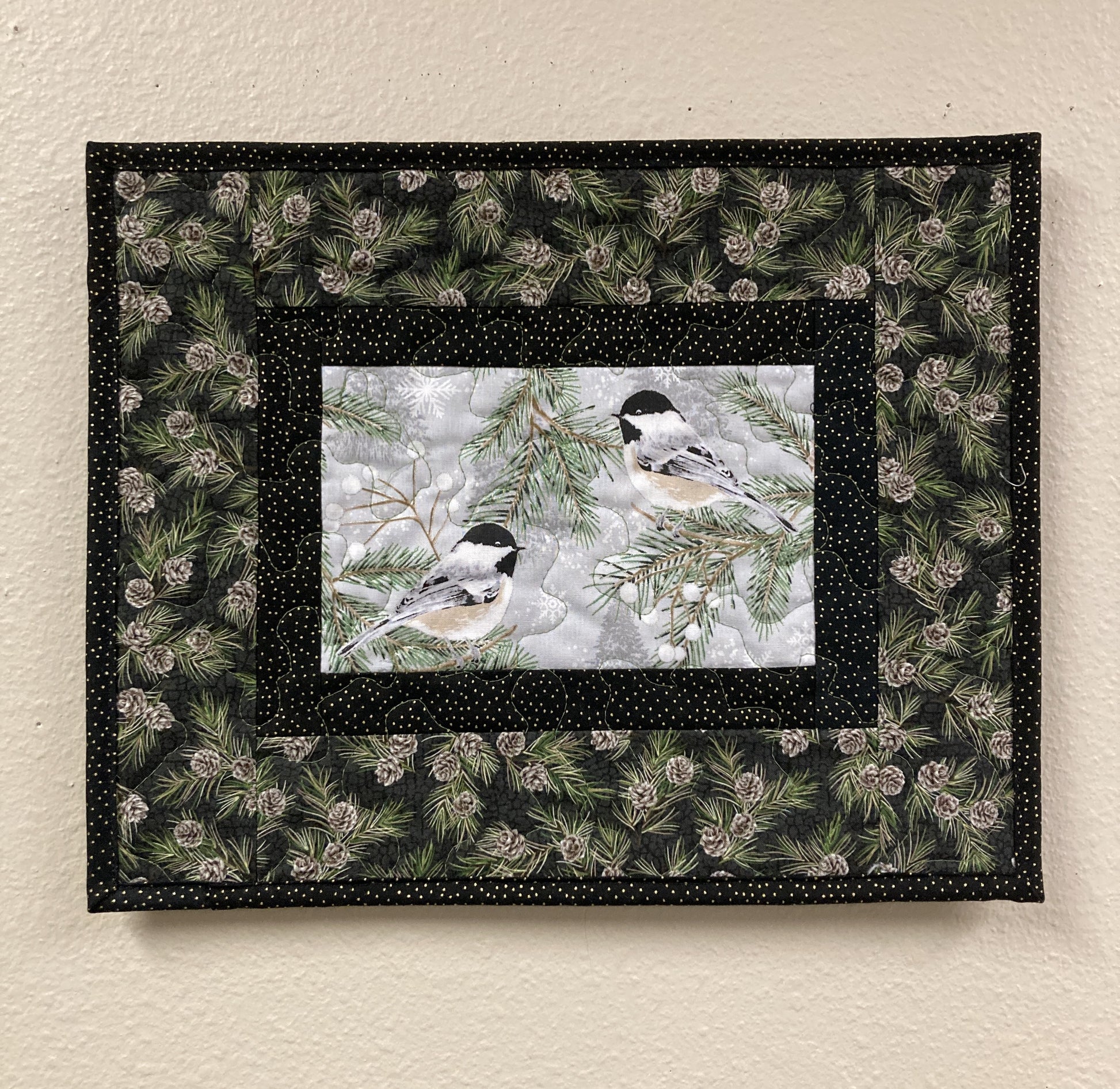 The adorable mountain chickadee love birds are perfect for your year round or holiday decor. Chickadees sitting on pine cones and branches surrounded by a pine cone border is a perfect small wall hanging for your home or office. The small size will fill any small space in your home, and is ideal for year round decorating. Small rings are sewn on the top back for hanging.