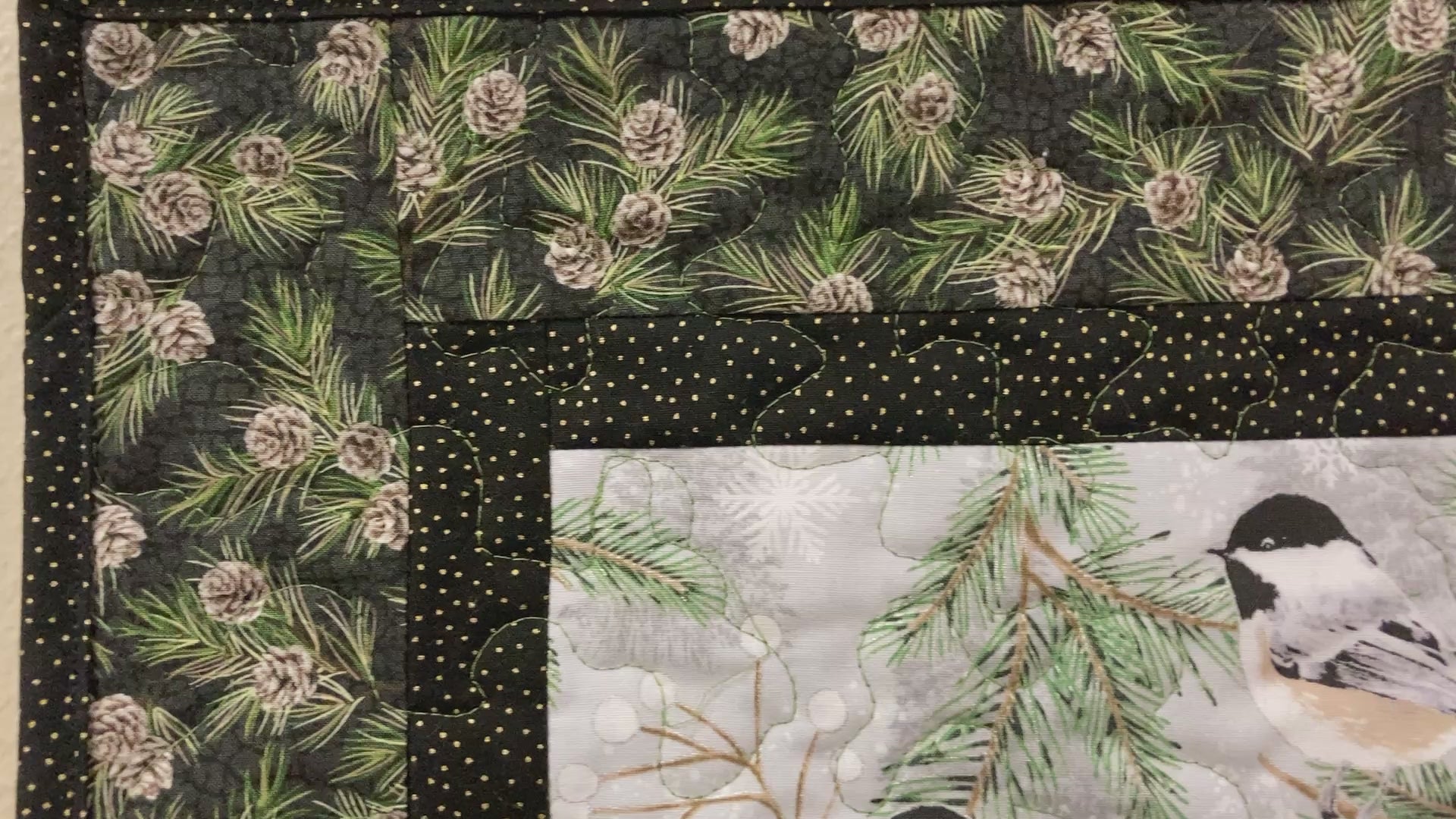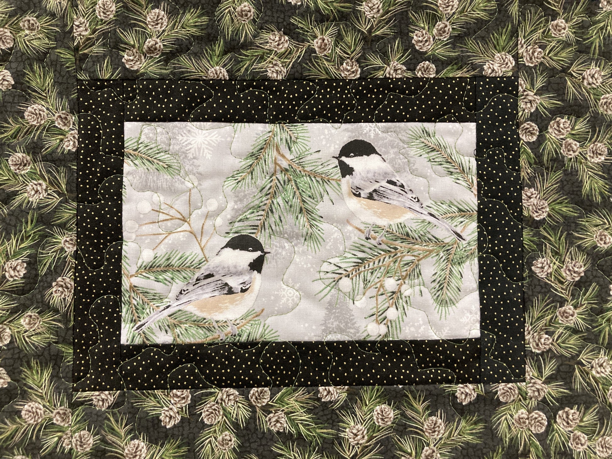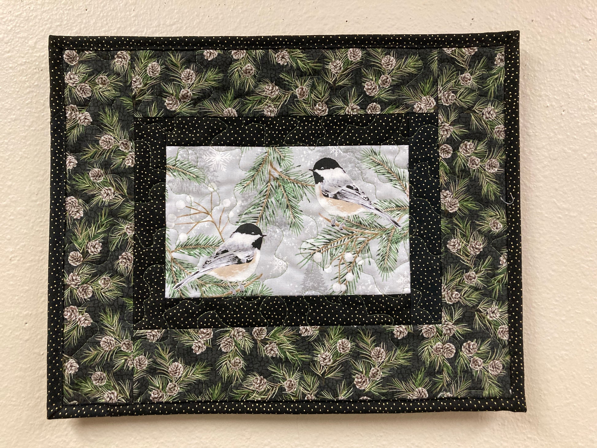 Chickadees on Winter Pine Cones Bird Quilted Wall Hanging, 12x15", Vertical Narrow, Mountain Cabin Decor, Bird Lover Gift Woods Handmade
