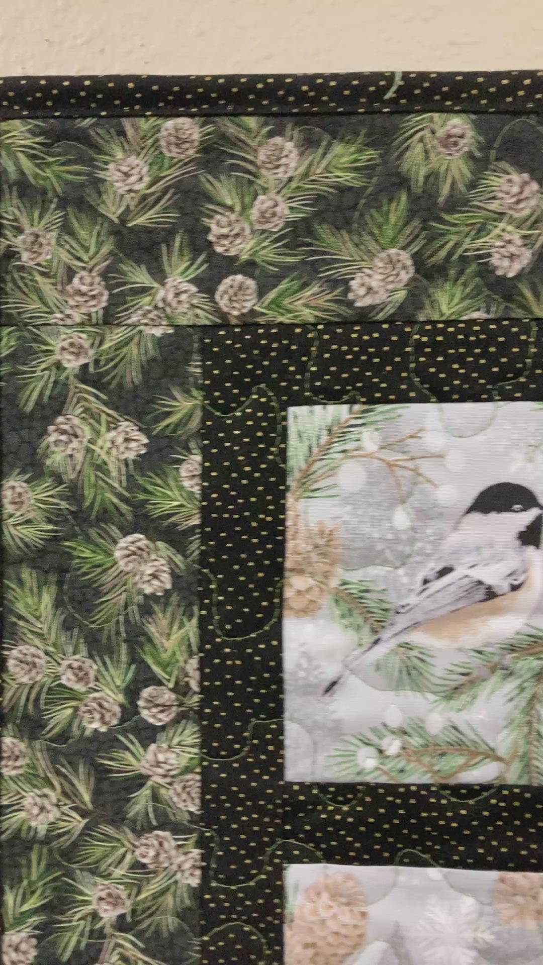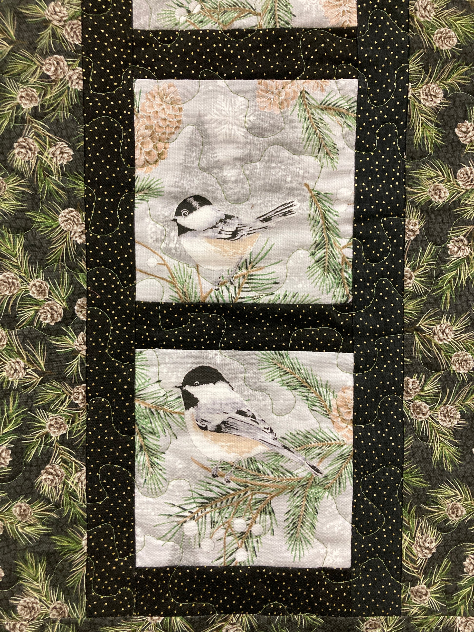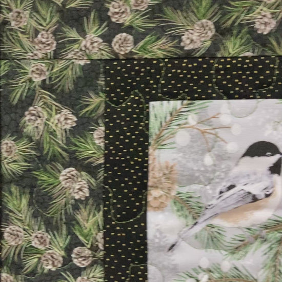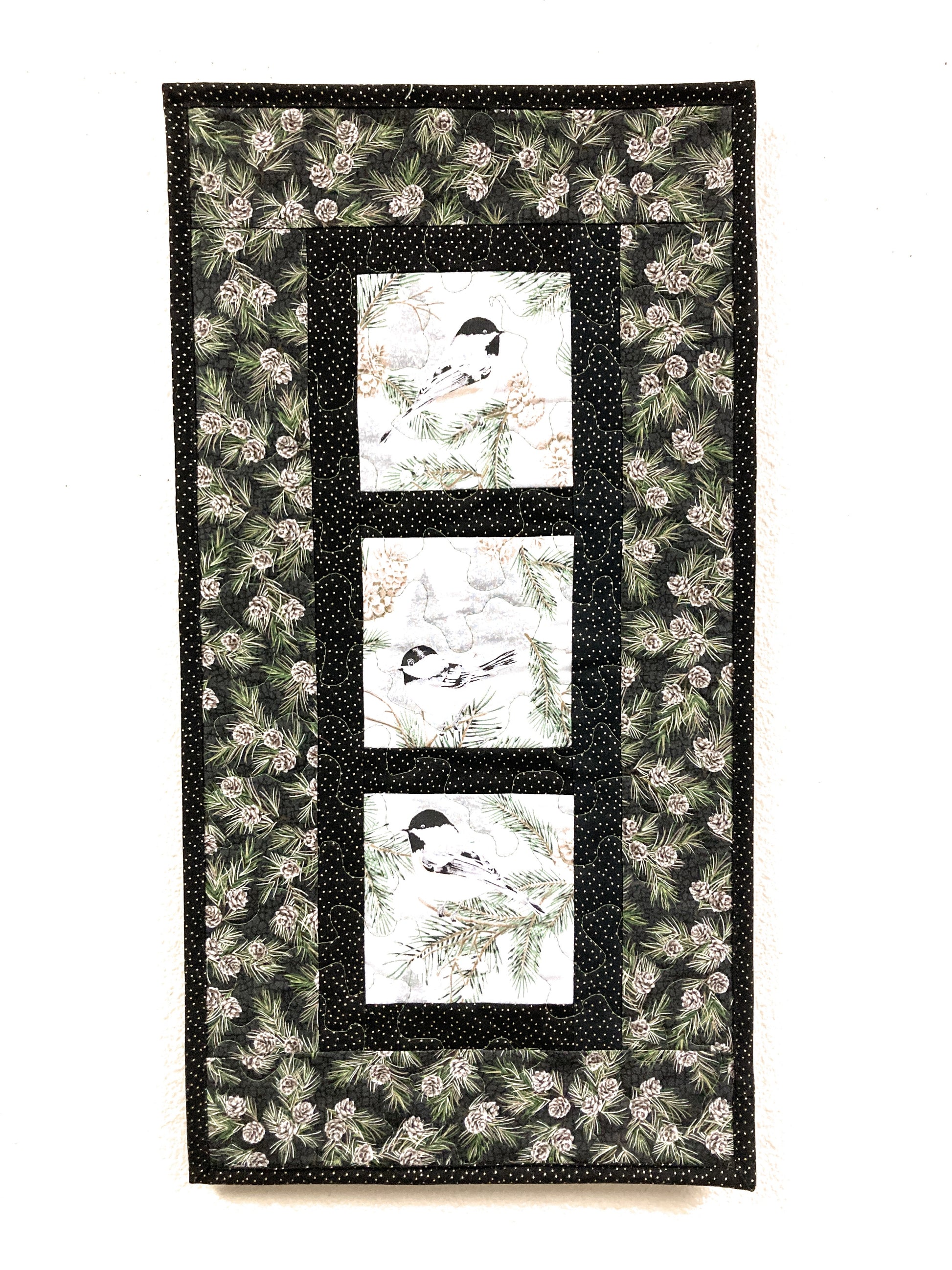 Chickadees on Winter Pine Cones Bird Quilted Wall Hanging, 12x23", Vertical Narrow, Mountain Cabin Decor, Bird Lover Gift Woods Handmade