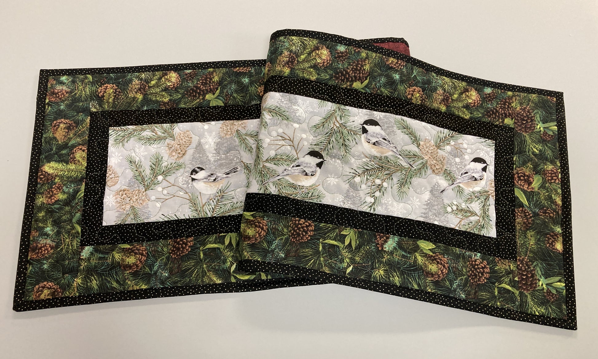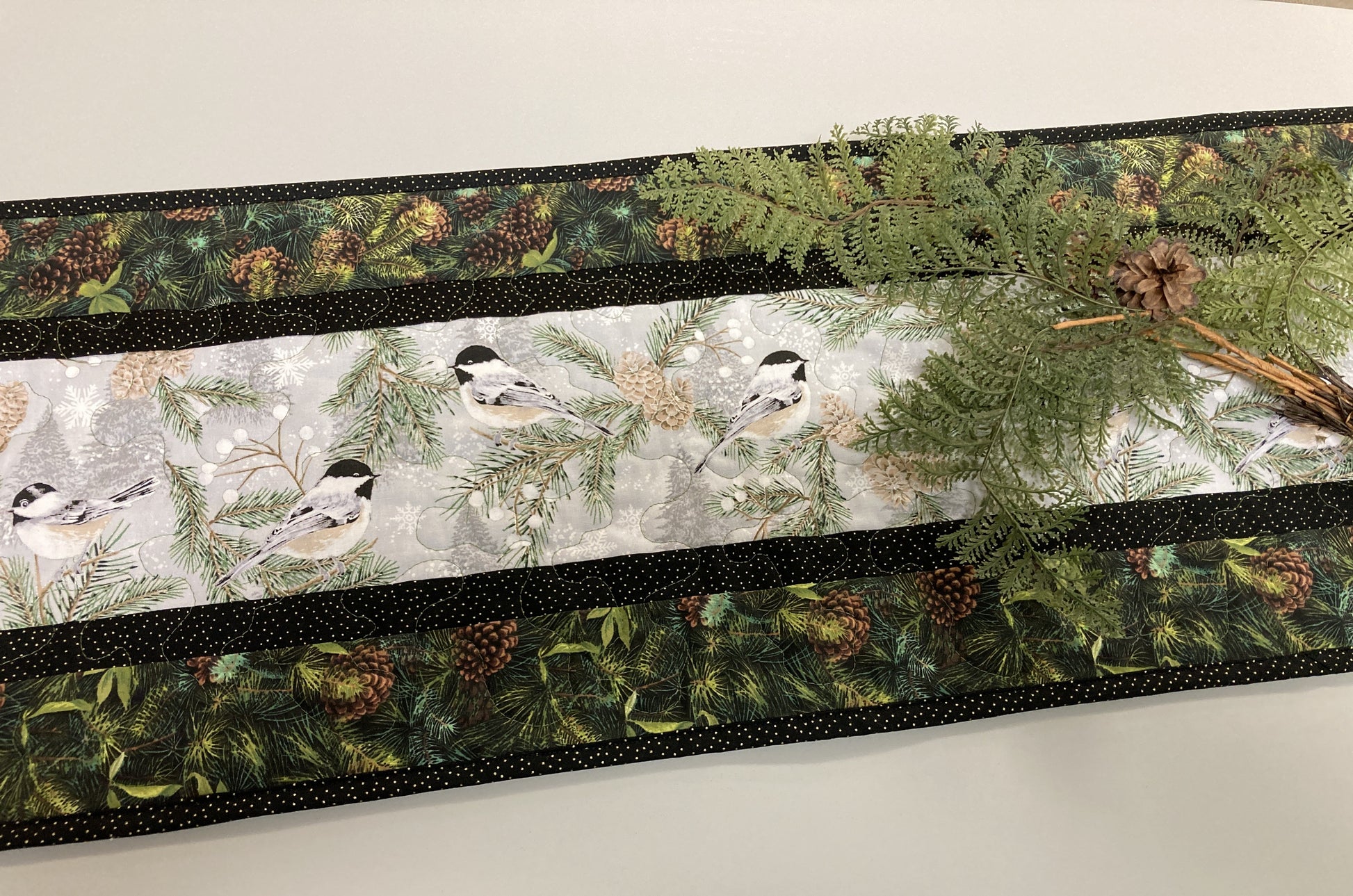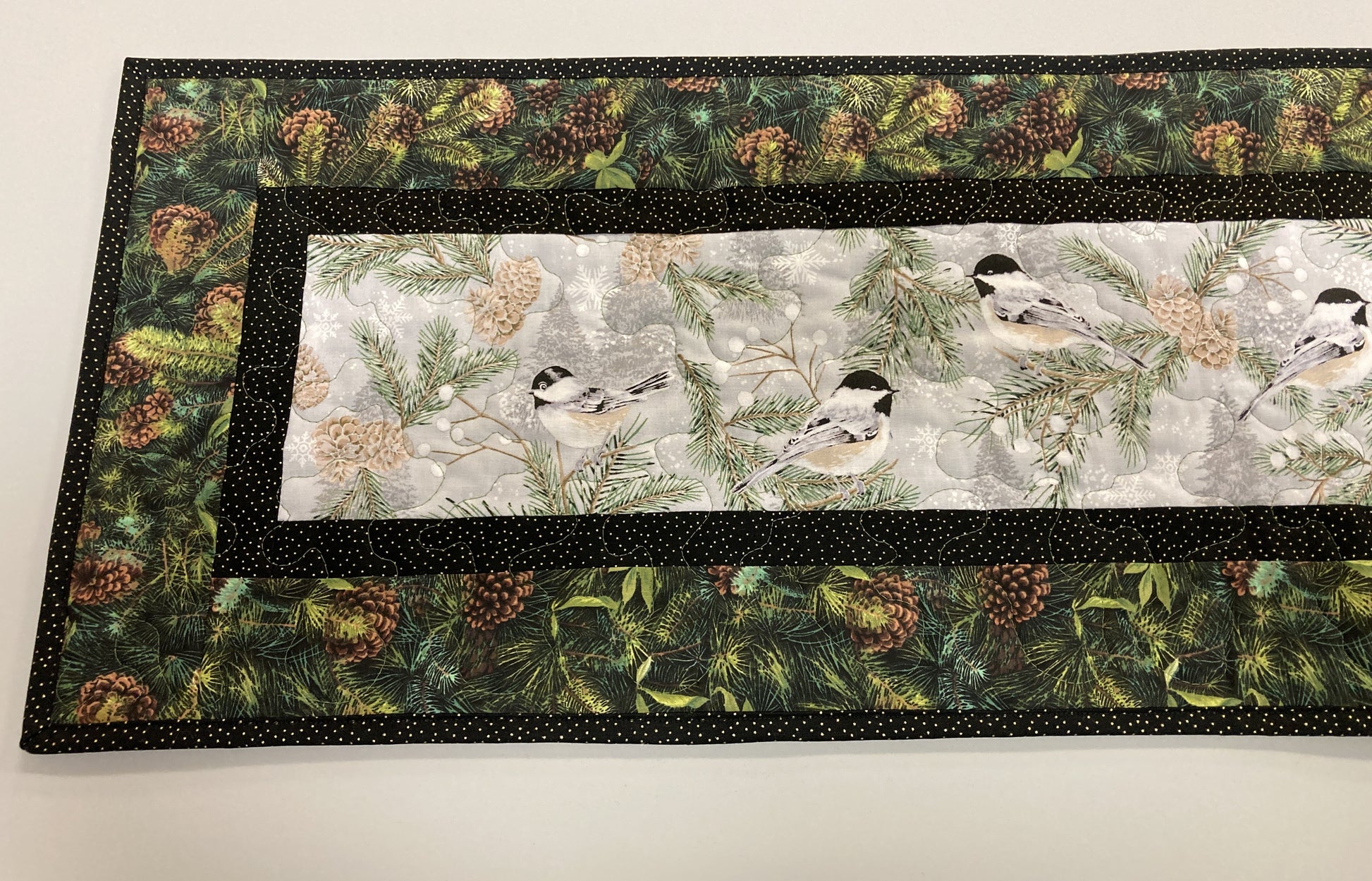 Chickadees set against a cream background highlight this quilted table runner. Although there are subtle snowflake outlines in the chickadee fabric, this runner would certainly work year round in your home as a centerpiece for year round decorating. The pine cone border completes the mountain feel of this runner. The back is a burgundy fabric, having you ready for other seasonal decor.
