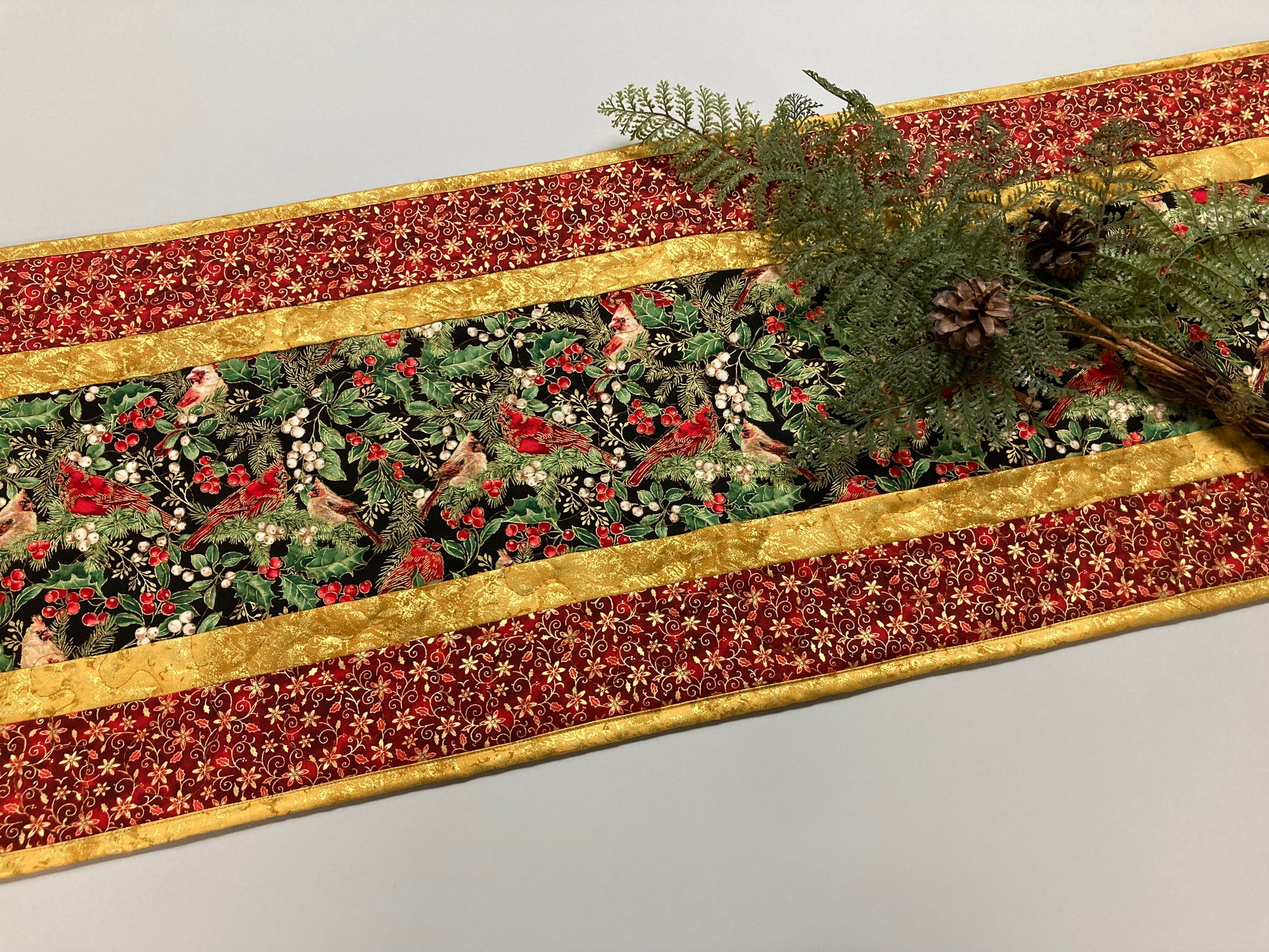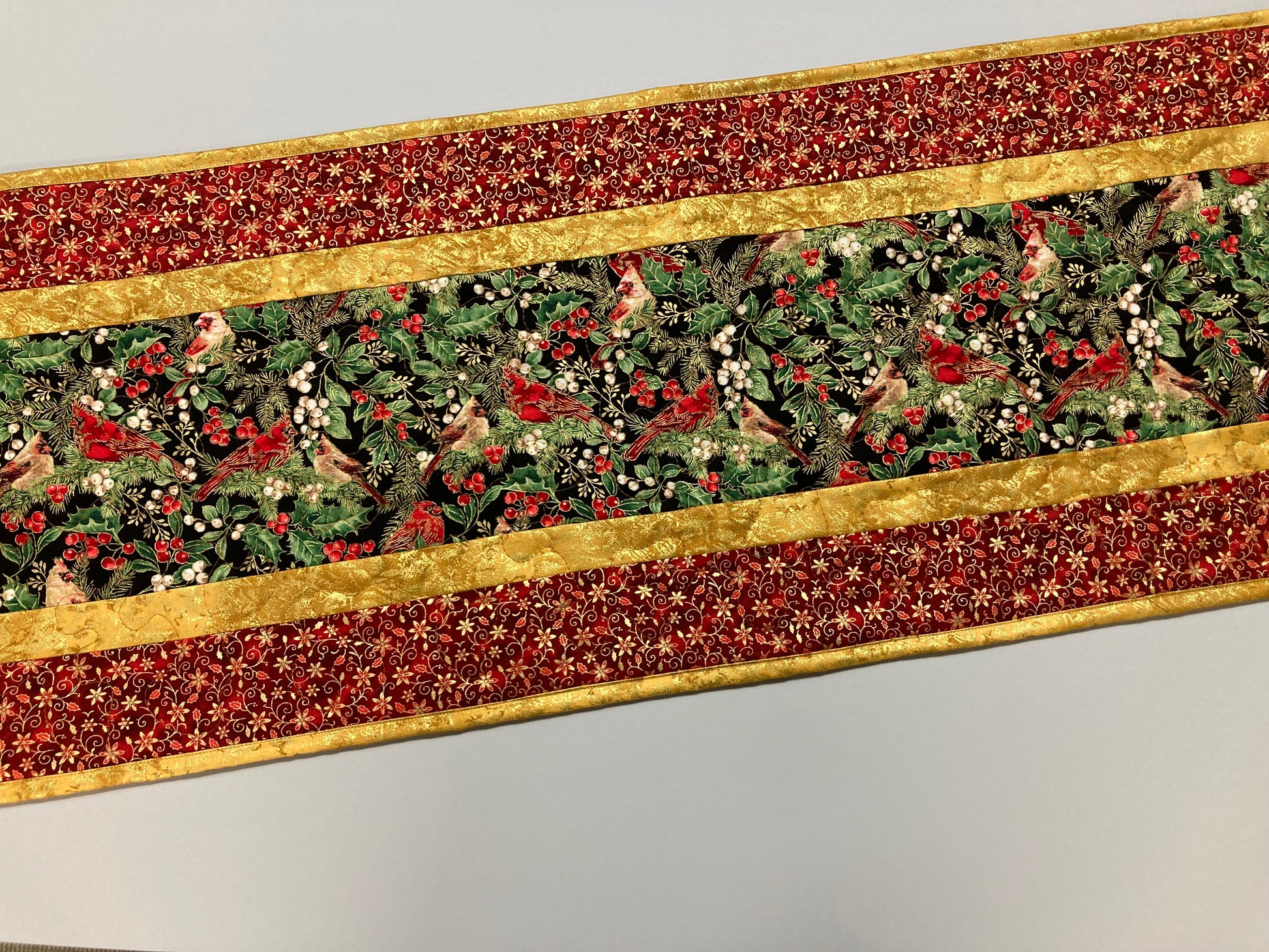 Christmas red cardinals and chickadees highlight this quilted table runner. The birds flock to roost on the pine tree and holly branches. The outer border of of red with a gold holly design completes this winter scene beautifully, and can be used well past the holday season.