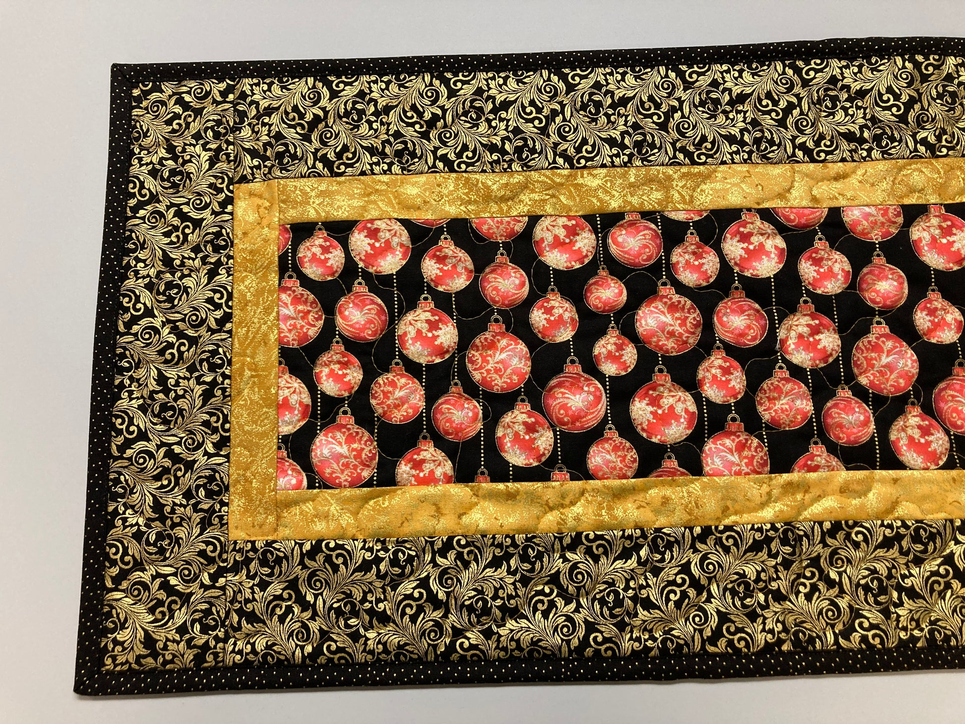 Christmas Red Gold Tree Ornaments Quilted Table Runner, 13x48", Winter Holiday Dining Coffee Table, Dresser Scarf End Table Handmade