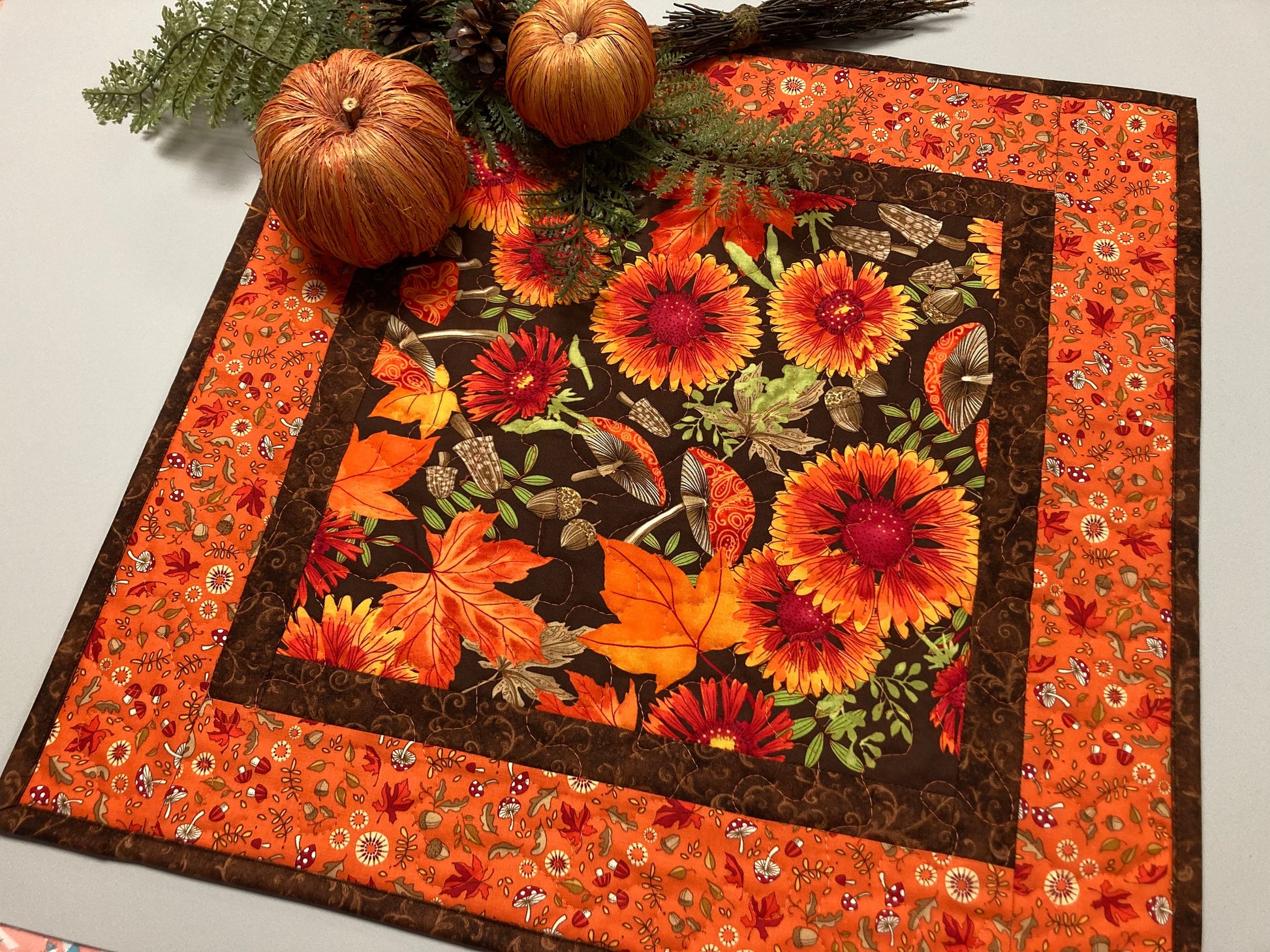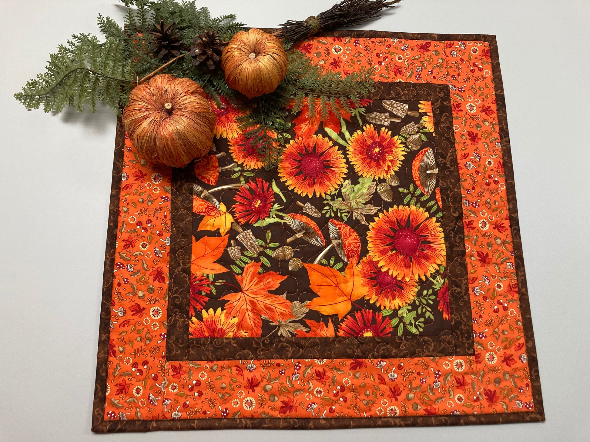 Fall Sunflowers Mushrooms and Acorns Quilted Table Topper, 20x20" Reversible Leaves Woodland Forest Orange Red Green Dining Coffee End Table