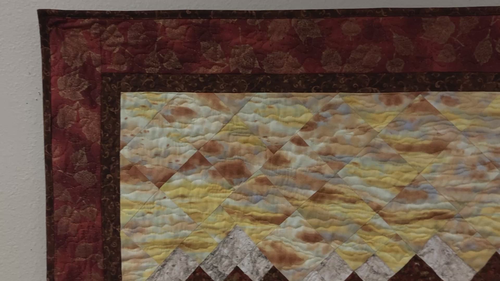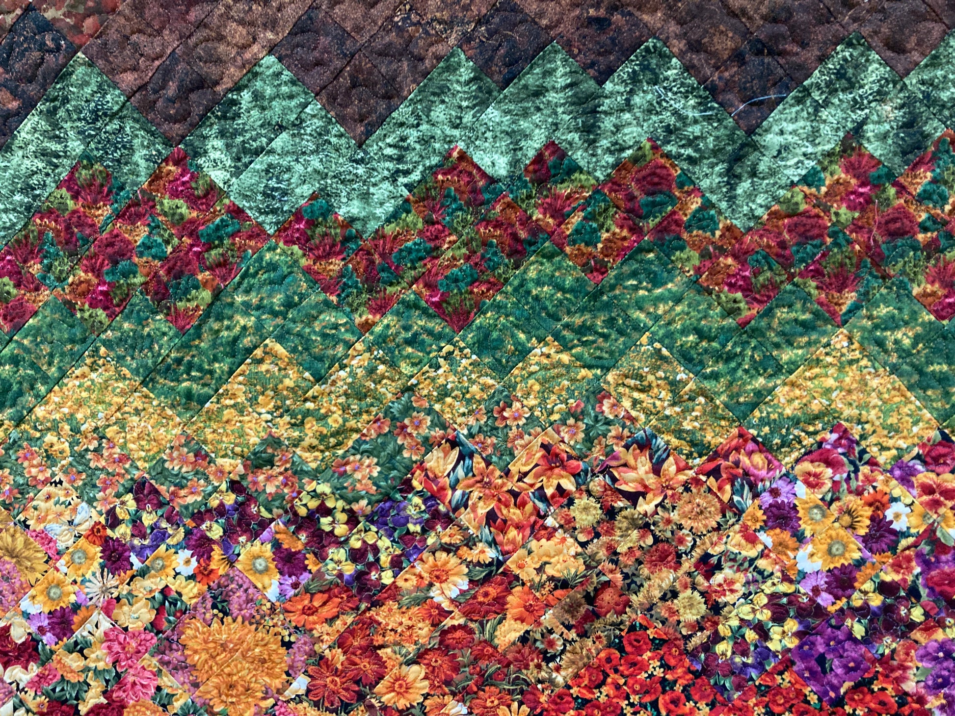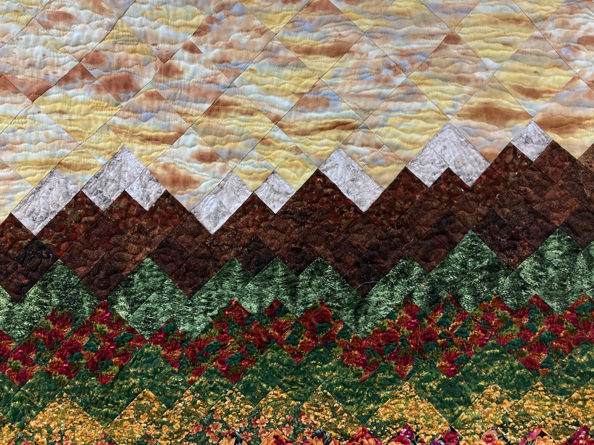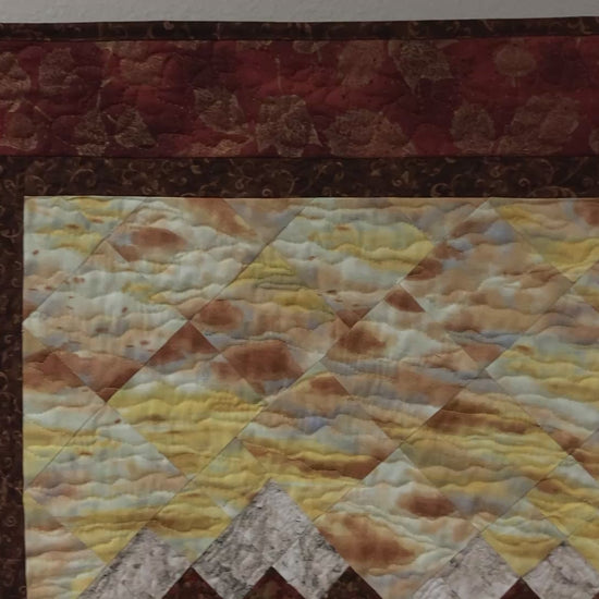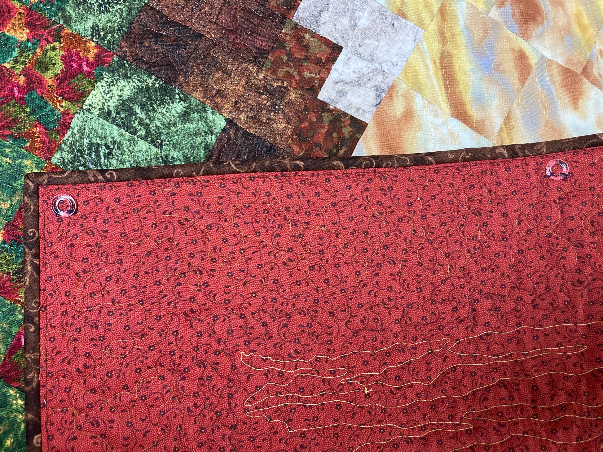 A beautiful fall autumn sunset over a meadow of fall flowers. Red, purple, gold and orange flowers create a vibrant sea of color nestled beneath a field of golden green grass. Darker green mountains lead to snowy peaks beneath a golden sunset sky. This art quilt tapestry would be a gorgeous focal point in any room over a sofa, stairway, or bed. Small rings are sewn on the top back for hanging.