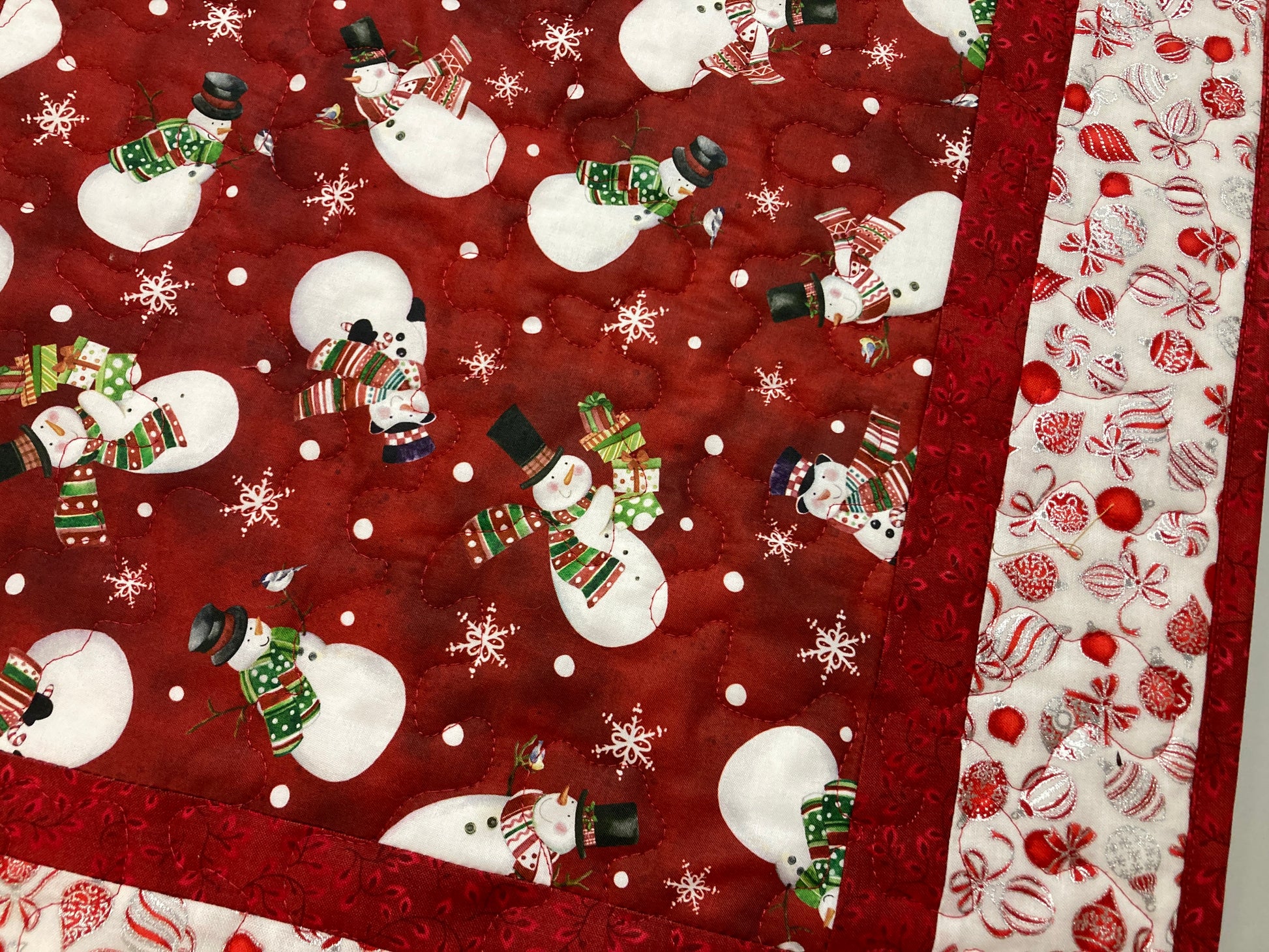 Jolly snowmen draped in winter scarves grace the middle of this Christmas winter holiday table square. A red and silver ornament fabric was used for the border, tying together the festive winter scene. The back is a gray swirl fabric, making this runner reversible for other seasonal decor. This table topper square will be sure to bring a smile to your face this holiday season.