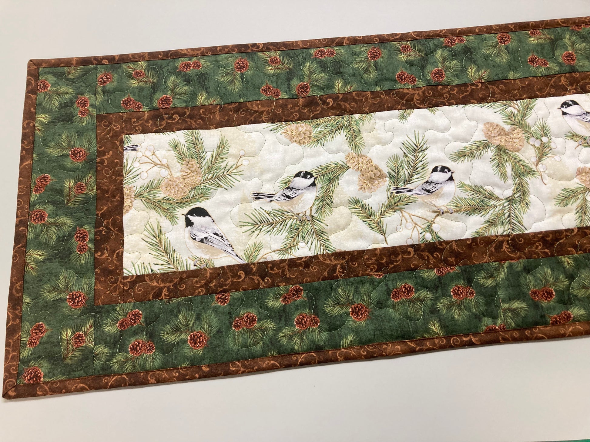Pine Cone Mountain Chickadees Quilted Table Runner, 13x48", Reversible Fall Birds Buffet Coffee Dining Table Decor Winter Christmas Everyday