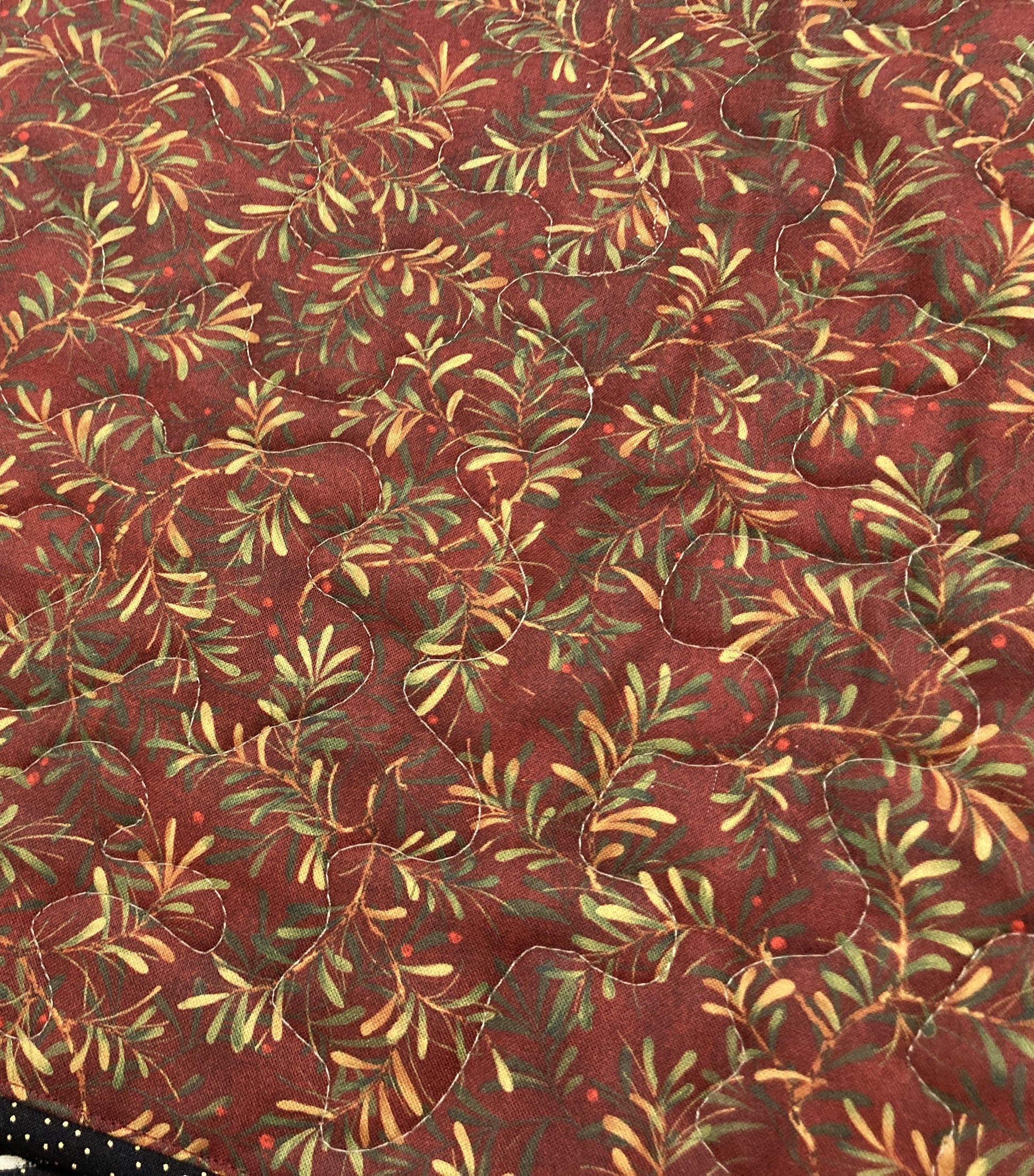 Chickadees set against a cream background highlight this quilted table runner. Although there are subtle snowflake outlines in the chickadee fabric, this runner would certainly work year round in your home as a centerpiece for year round decorating. The back is a fall fabric, having you ready for other seasonal decor.