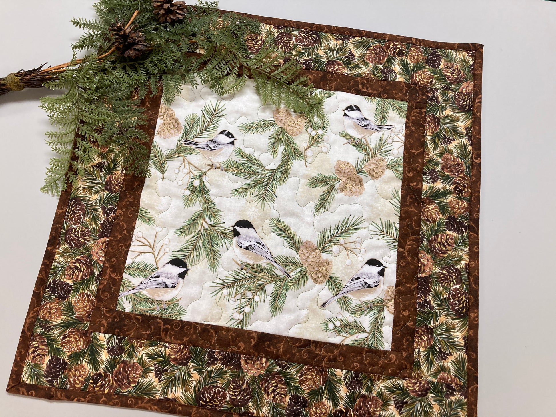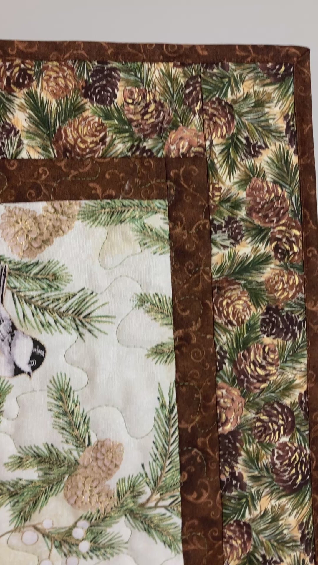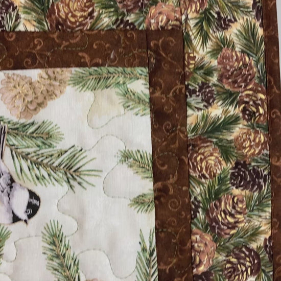 Chickadees sitting on pine branches surrounded make up the middle of this quilted table topper. The outer border is a beautiful pine cone fabric. This topper is perfect for your rustic cabin mountain decor or any home to welcome in the beautiful winter season or year round decorating in your home