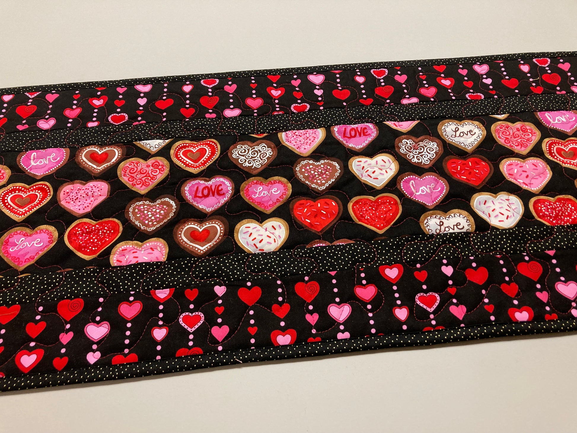 Pink and red heart candy on a black background sparkle on this quilted Valentine's day runner. The inner black border highlights the pink and red colors, as does the pink heart border fabric. The reverse is a spring summer green fabric, perfect for St. Patrick's Day and other seasonal entertaining.