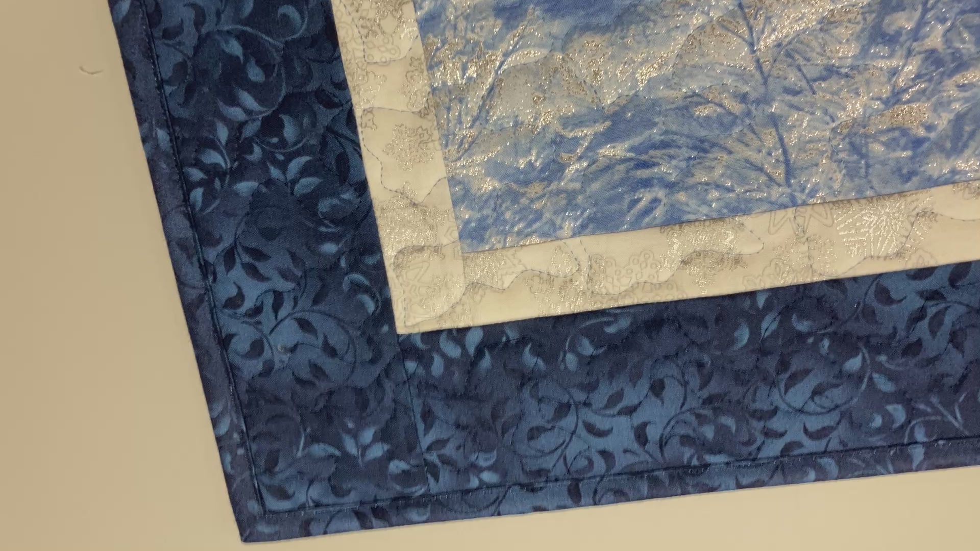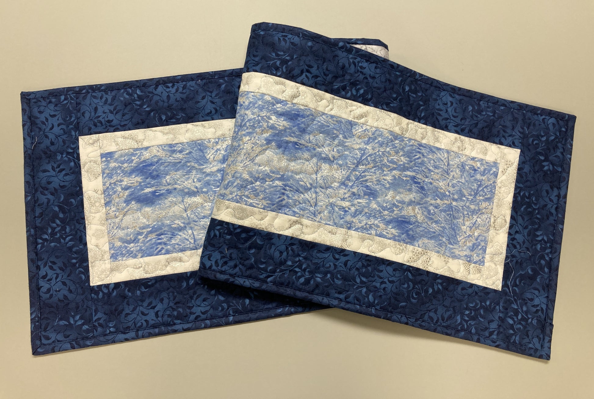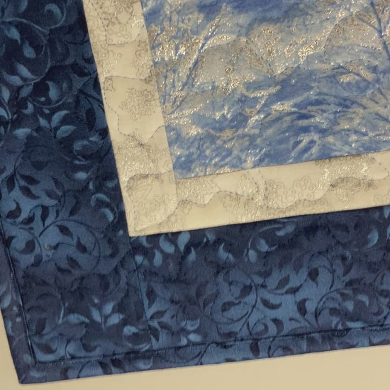 Silver highlights on blue snowy trees grace this quilted table runner. It's like a winter wonderland at the center of your table. A blue border completes this serene image. Use for Christmas or Hanukkah, the blue silver colors are gorgeous for either holiday. This runner is perfect through our snowy winter season, and into the new year! The back is another gray wispy tree fabric, having you ready for other seasonal decor.