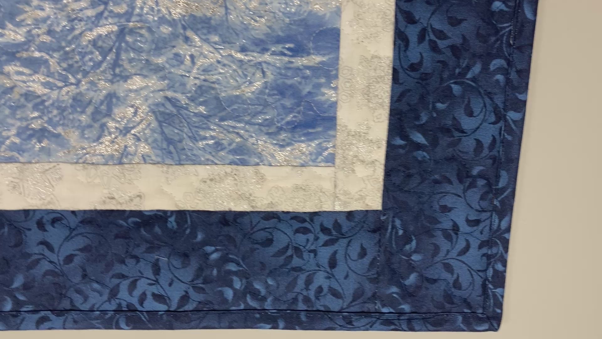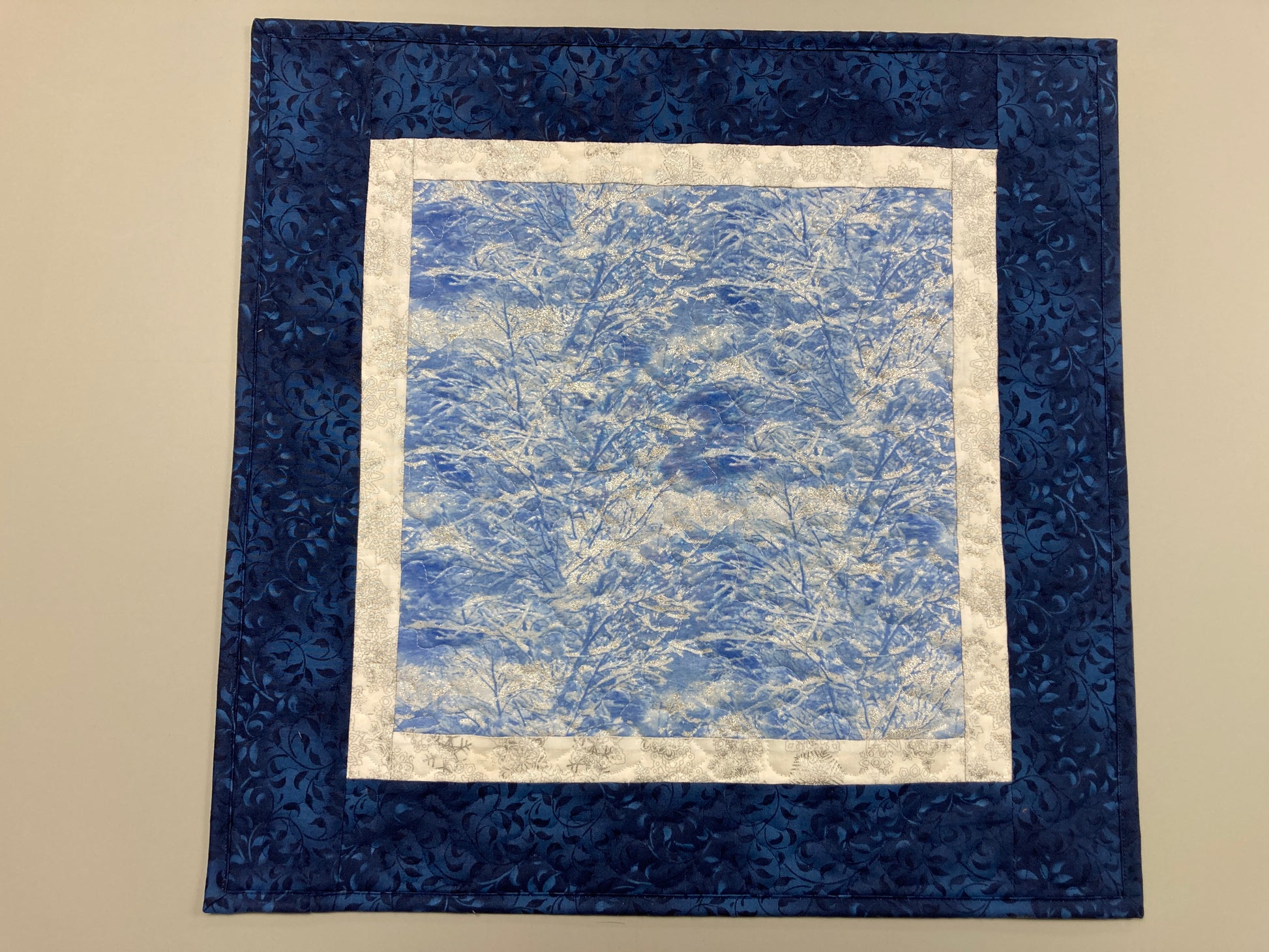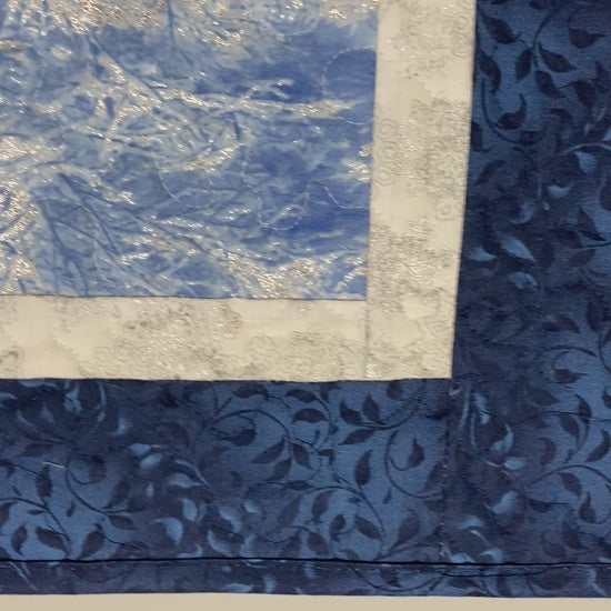 Silver highlights on blue snowy trees grace this quilted table square topper. It's like a winter wonderland at the center of your table. A blue starry sky border completes this serene image. Use for Christmas or Hanukkah, the blue silver colors are gorgeous for either holiday. This table square is perfect through our snowy winter season, and into the new year!