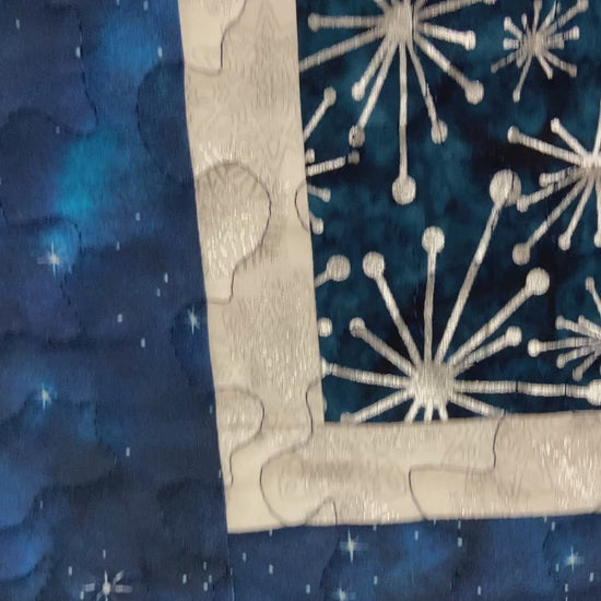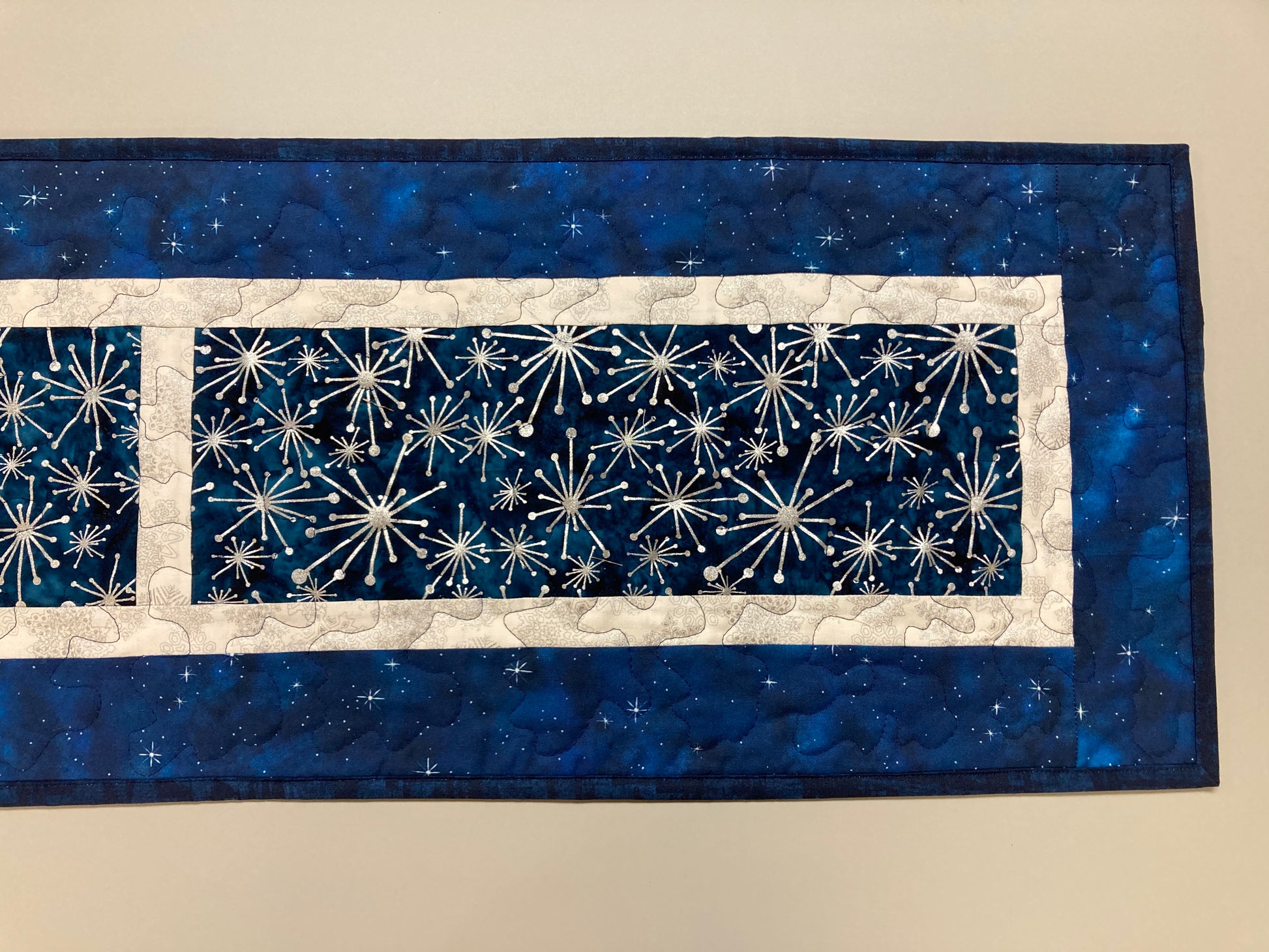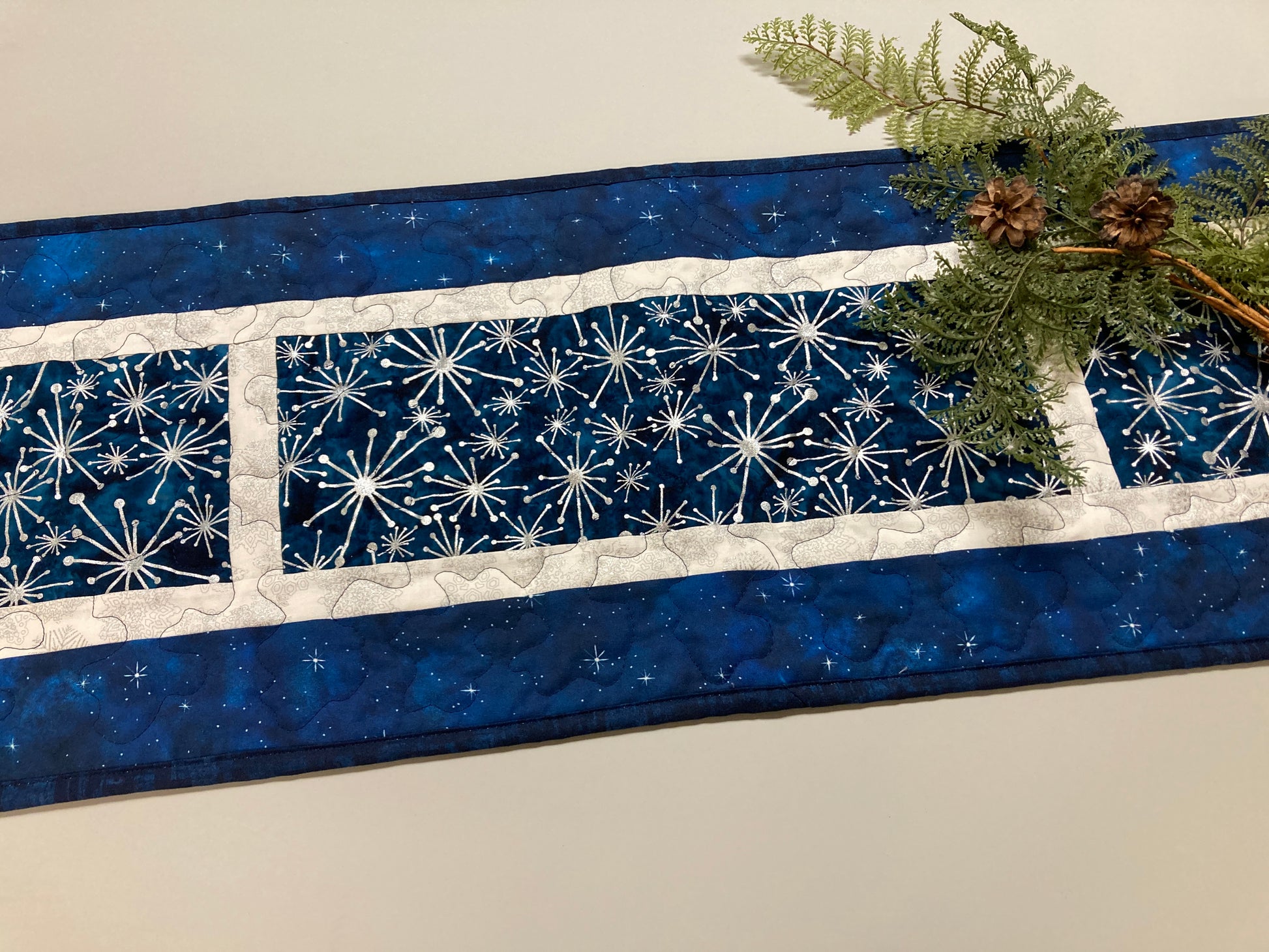 A gorgeous blue and silver snowflake batik fabric takes center stage on this winter quilted table runner. A blue starry night fabric complete the beautiful winter setting. Perfect for Hanukkah or Christmas entertaining! The back white with light blue snowflakes fabric has you ready for other seasonal decor after the New Year.
