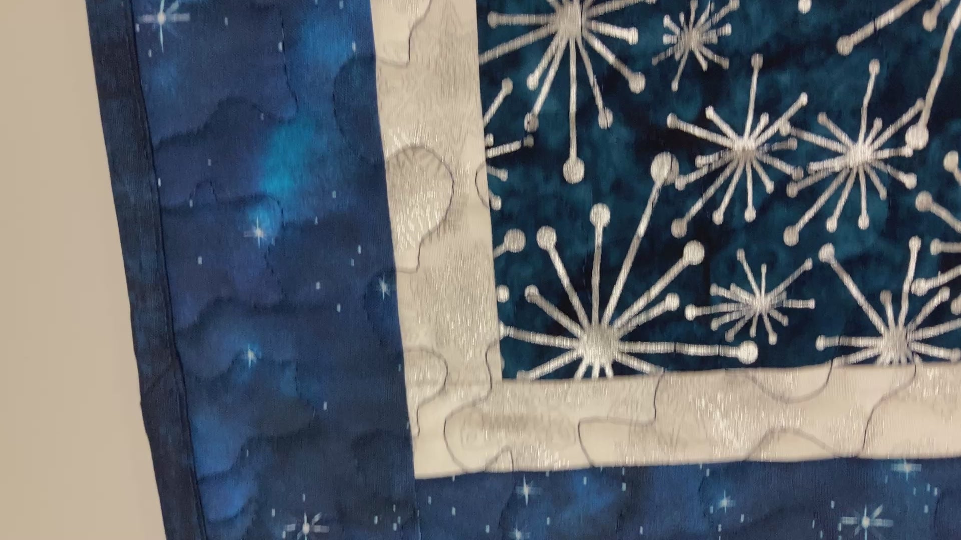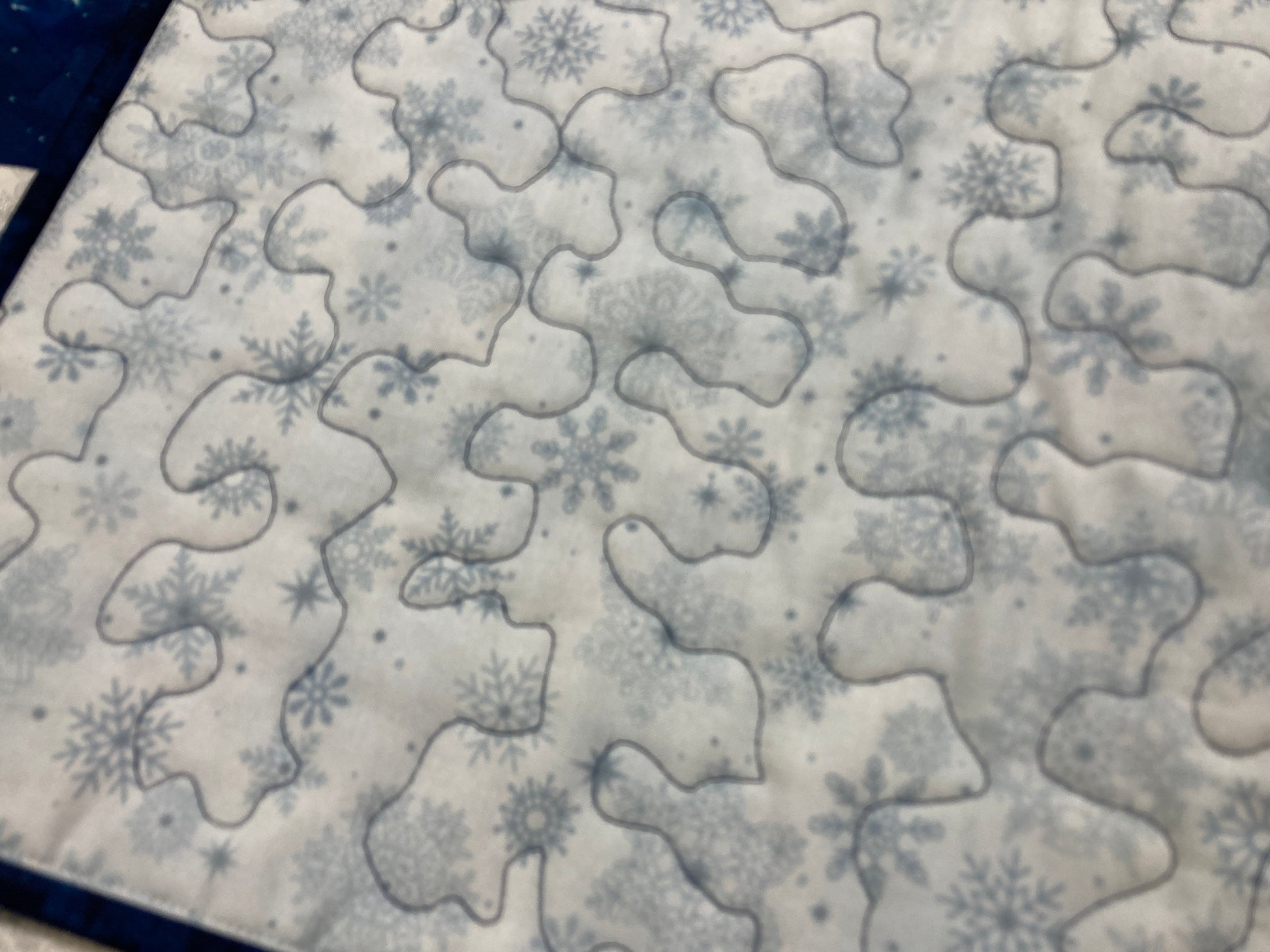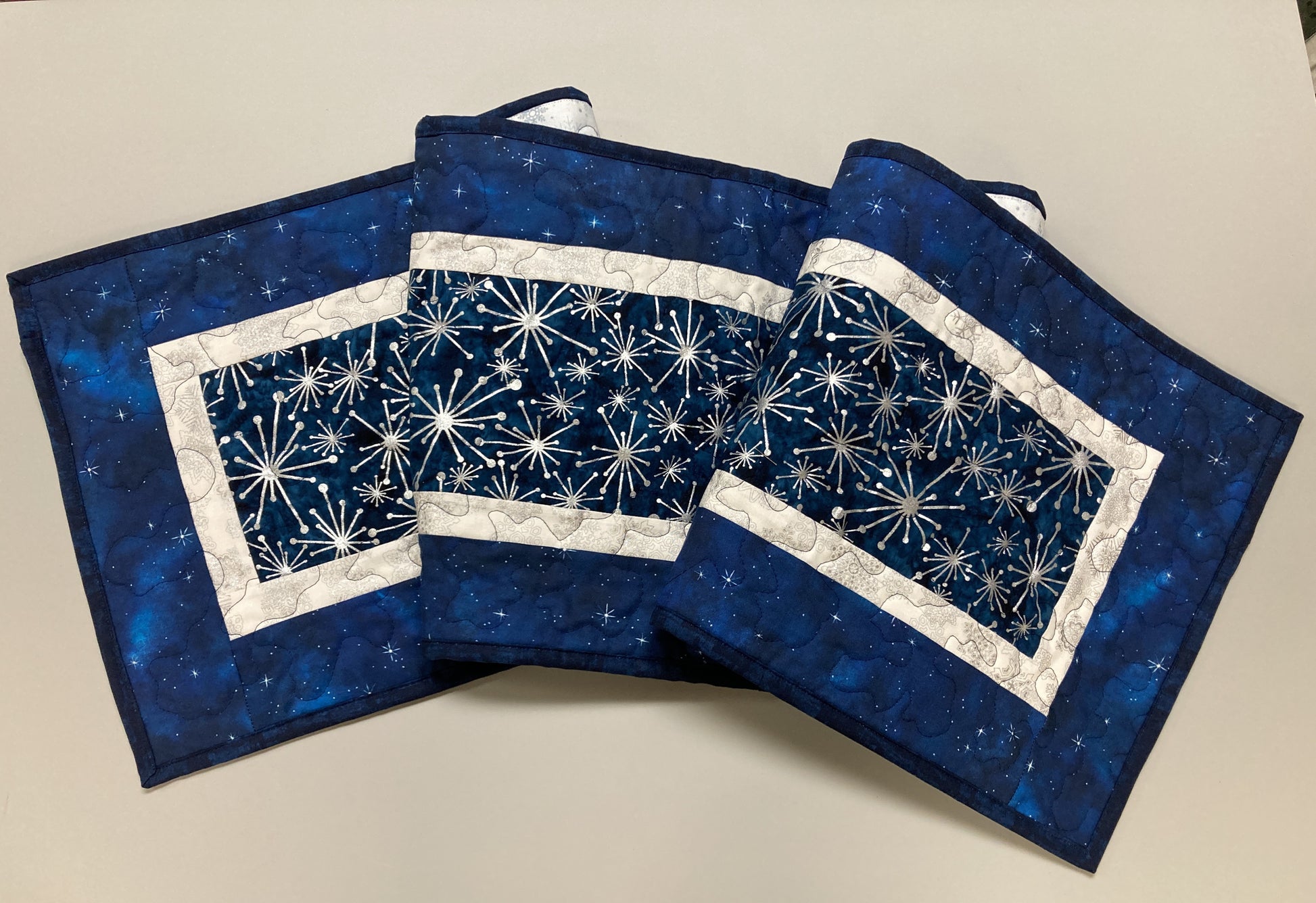 A gorgeous blue and silver snowflake batik fabric takes center stage on this winter quilted table runner. A blue starry night fabric complete the beautiful winter setting. Perfect for Hanukkah or Christmas entertaining! The back white with light blue snowflakes fabric has you ready for other seasonal decor after the New Year.