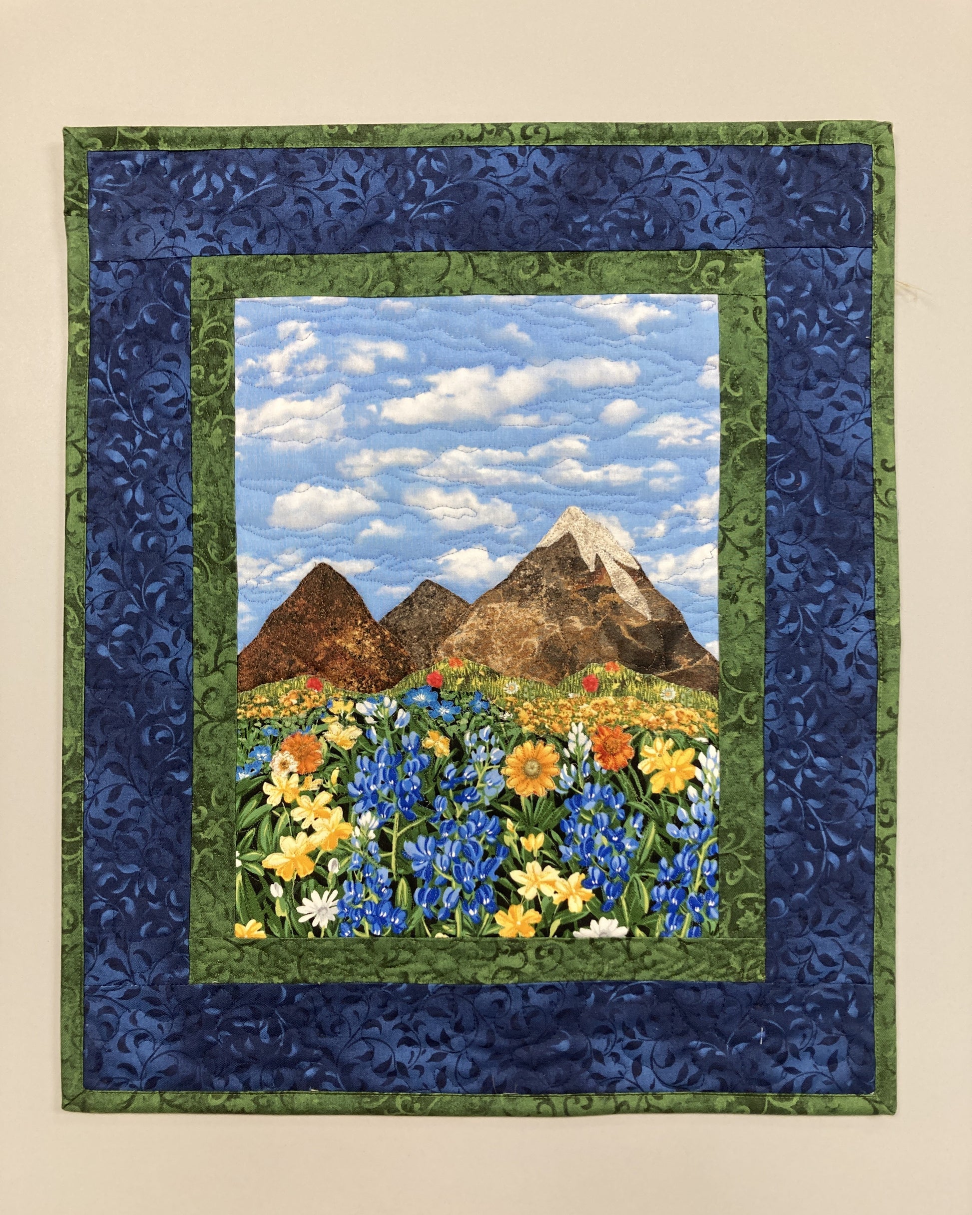 Snowy Mountains Meadow Flowers Landscape Art Quilt, Tapestry 16.5x19", Fabric Wall Hanging, Small Wall Art Alpine Blue Yellow Flowers Skies