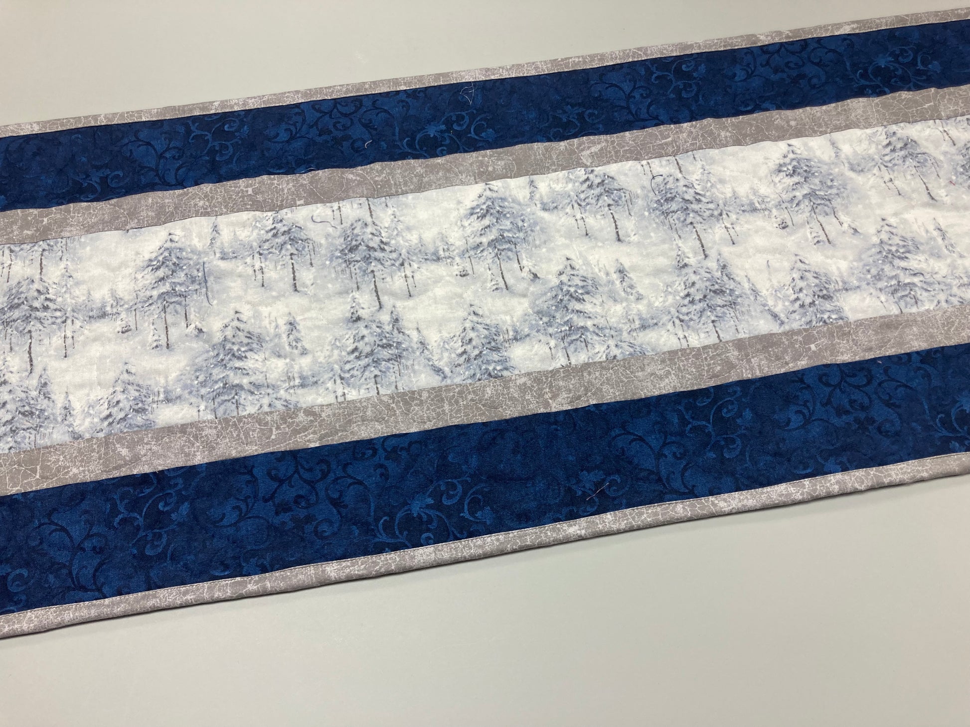 Snowy Winter Trees Quilted Dining Table Runner, 13x48 Reversible, Blue Coffee End Table Cabin Everyday Nature Woods Mountains Handmade