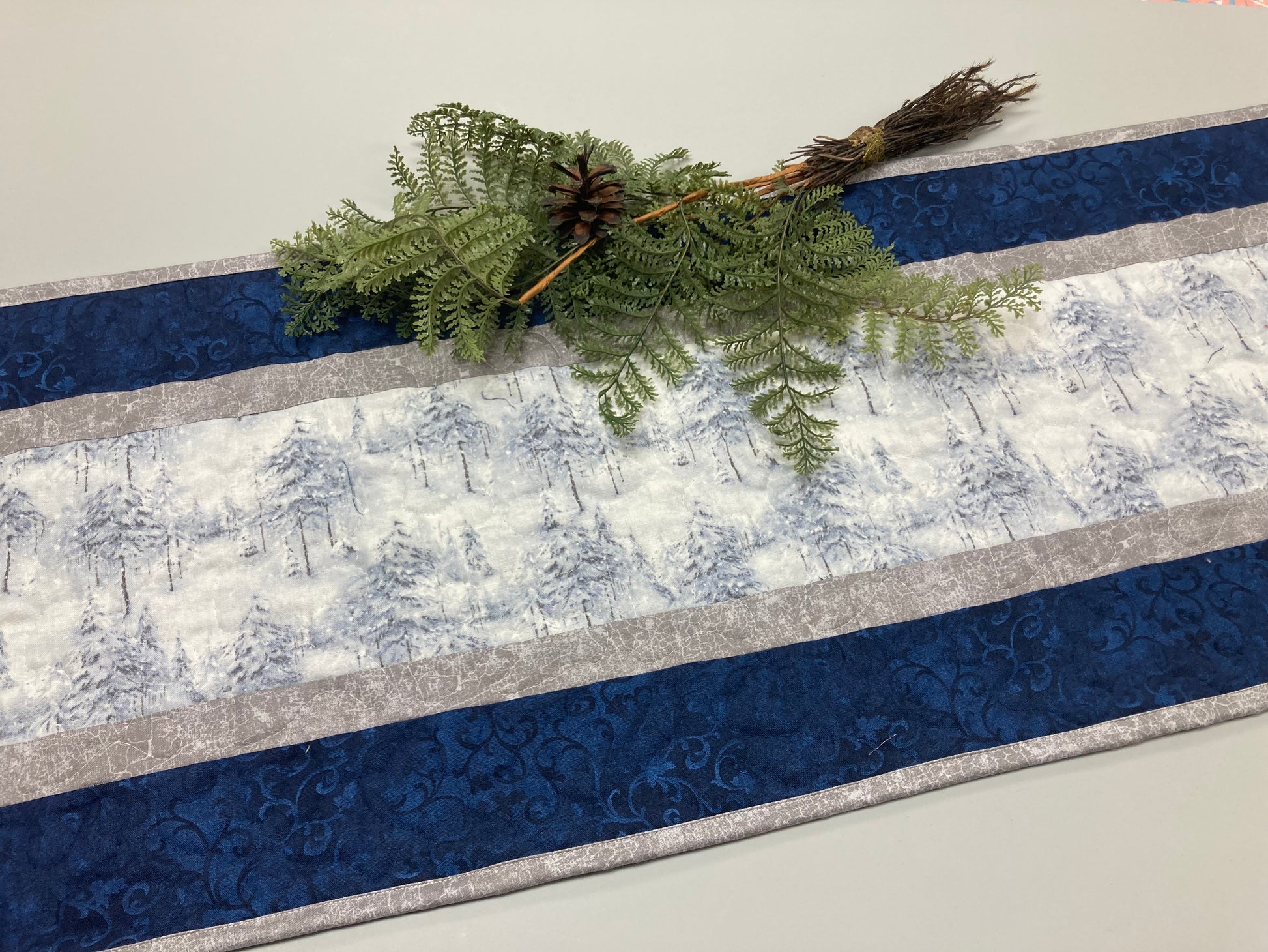 Snowy pine trees in the middle of winter grace this quilted table runner. A blue border completes this serene image. The back is a pine cone fabric, having you ready for other seasonal decor. This runner is perfect through our snowy winter season!
