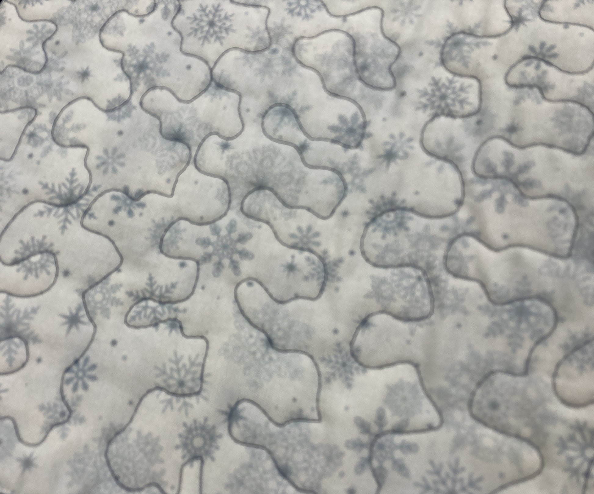 Winter white gray pine trees in the middle of winter grace this quilted table runner. A gray snowflake print border completes this serene image. The back is blue white snowflake fabric, having you ready for other seasonal decor. This runner is perfect through our snowy winter season!