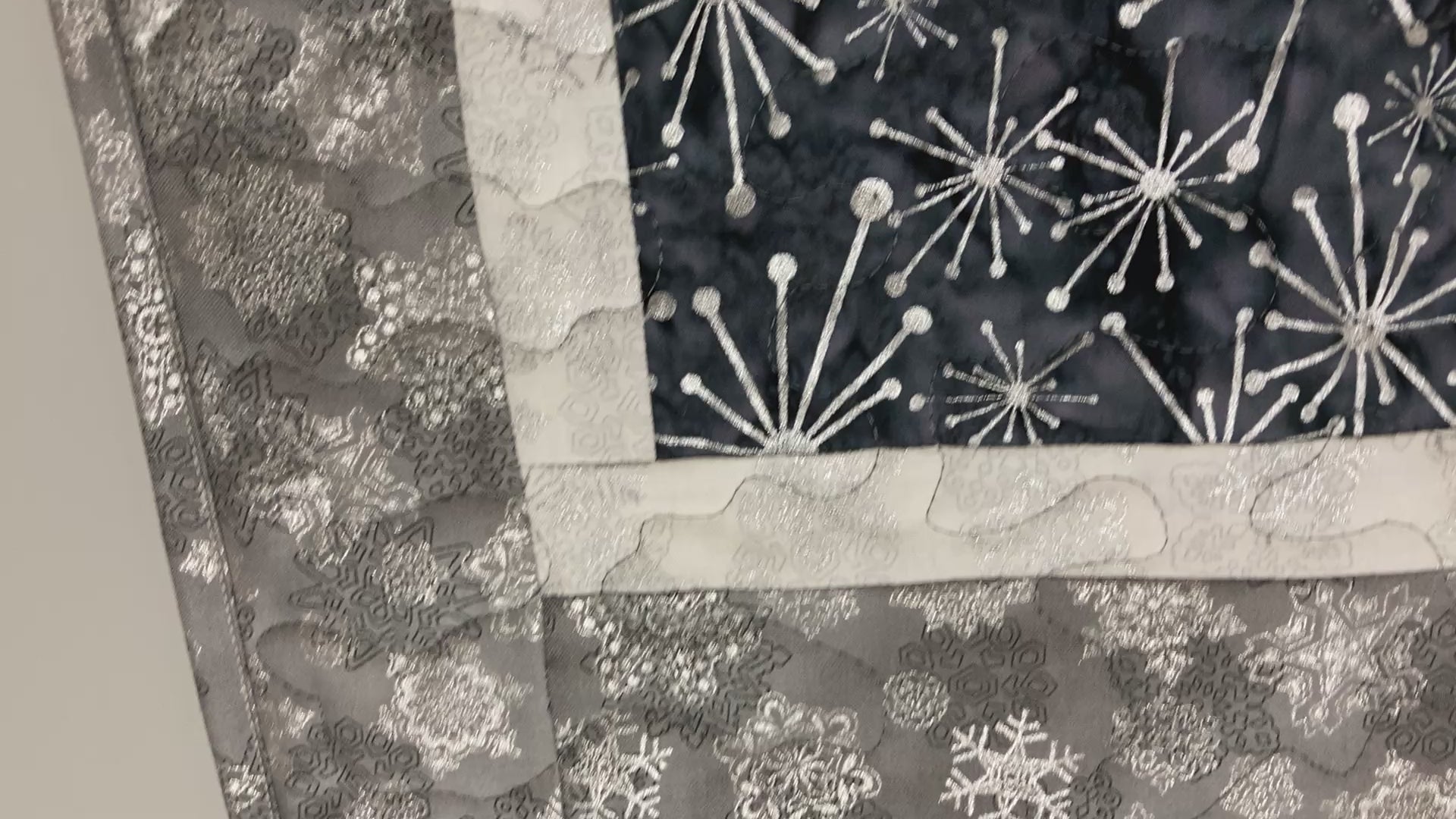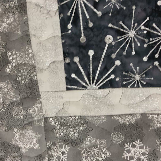 Silver winter white snowflakes against a dark gray background take center stage in this Christmas holiday quilted table runner. The light gray border completes the wintry scene for your entertaining. This focal fabric is a bit glittery, making the snowflakes seem to glisten. A truly beautiful tranquil table runner for your home! The back is a light blue snowflake fabric.